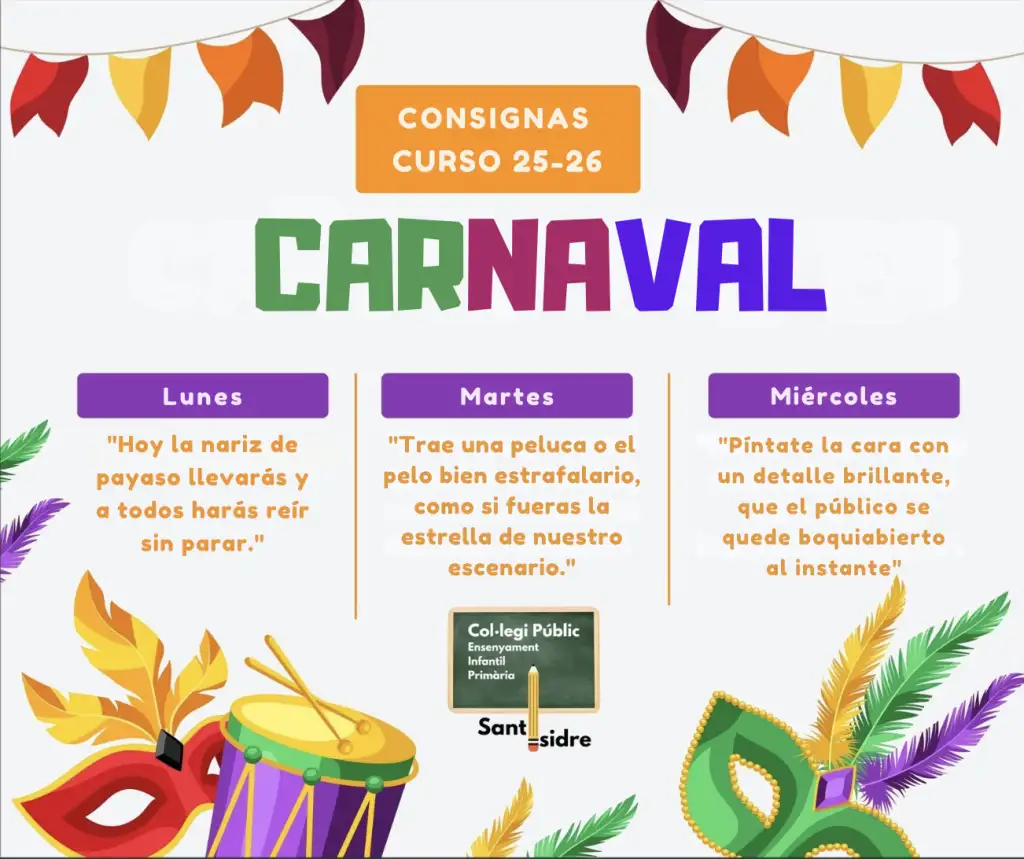 El próximo jueves 12 de febrero celebraremos en el CEIP Sant Isidre el Carnaval, una de las fiestas más esperadas del curso y totalmente conectada con nuestra línea motivadora: el circo. Pero antes… el espectáculo continúa desde el lunescon las tradicionales consignas de Carnaval, que convertirán cada jornada en un pequeño número lleno de humor, imaginación y participación.