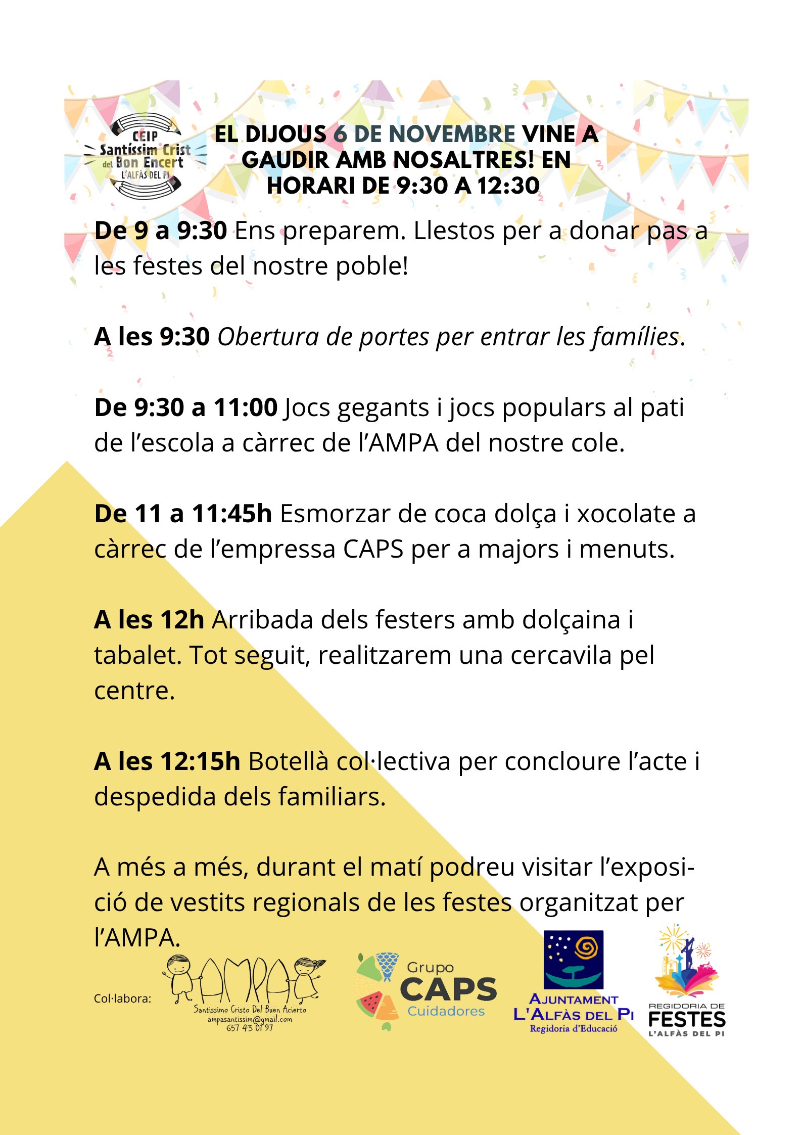 A més, el 6 de novembre obrim el centre a totes les families per a que ens acompanyen en unes jornades de convivència on jugarem tots junts a jocs tradicionals i gaudirem de la nostra particular “botellà”.