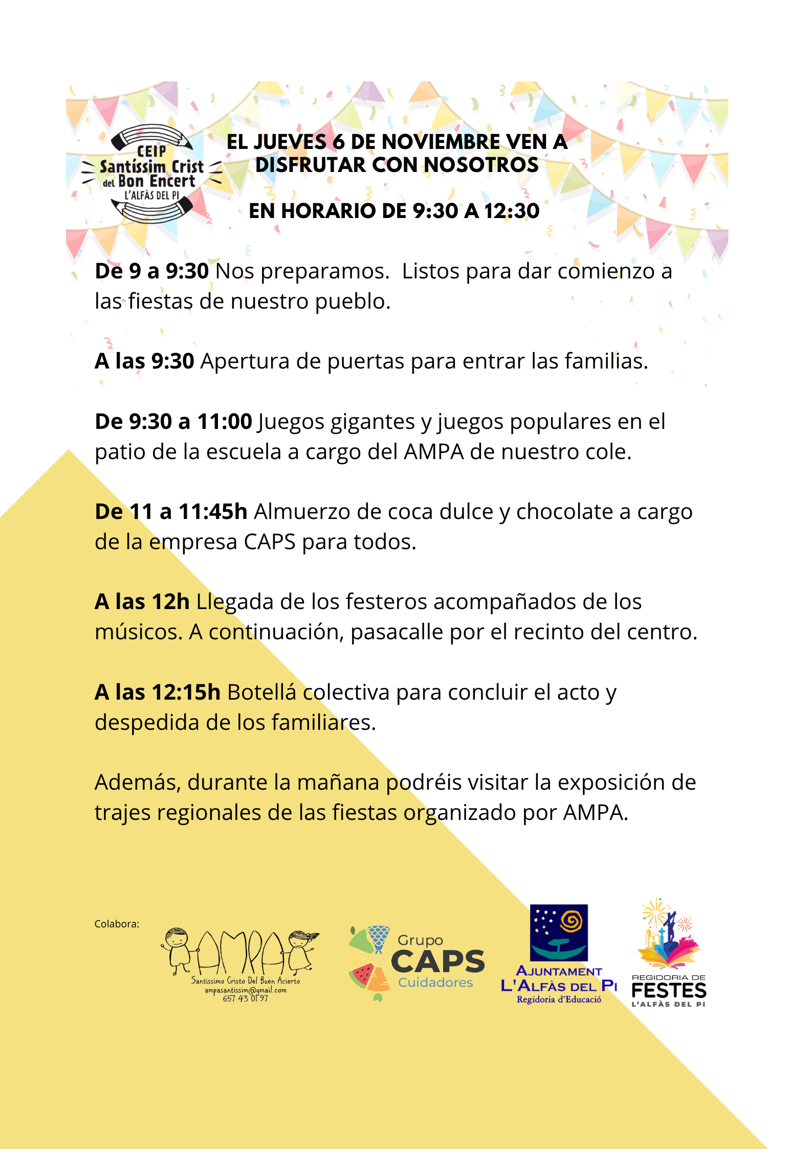 Además, el 6 de noviembre abriremos las puertas del centro a todas las familias para que nos acompañen en unas jornadas de convivencia en las que jugaremos a juegos tradicionales y disfrutaremos de nuestra particular “botellà”.