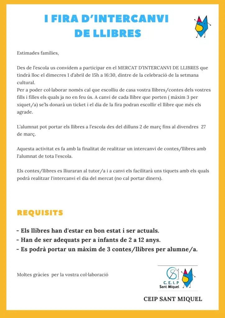 Des de l’escola us convidem a participar en el MERCAT D’INTERCANVI DE LLIBRES.