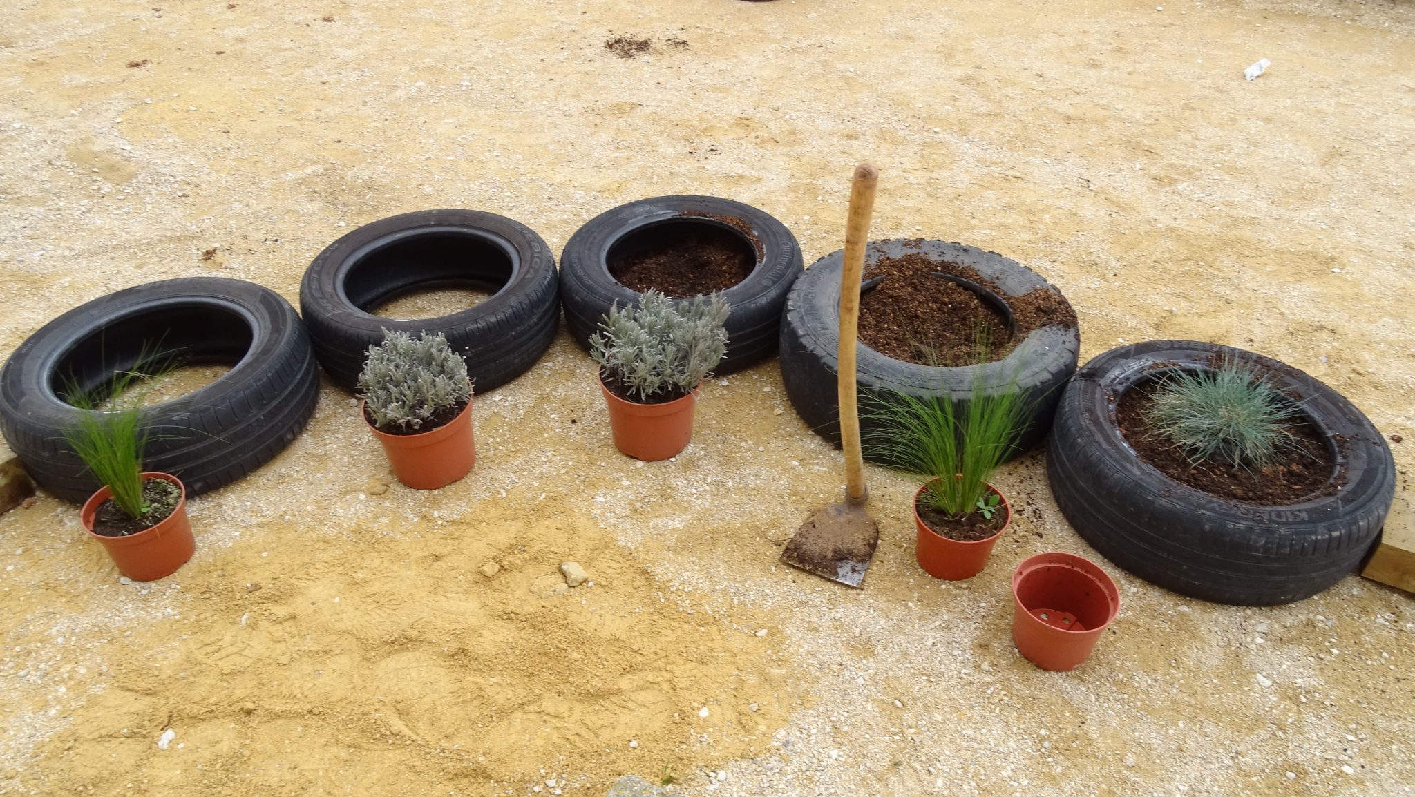 - Col·locació bigues de fusta i pneumàtics per fer una canalització d’aigua.