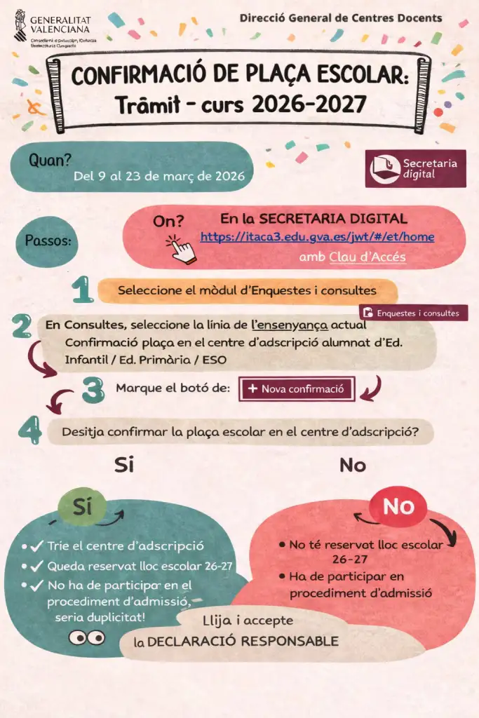 Per tant, heu de fer la confirmació de plaça escolar des de les 9:00 h del dia 9 de març de 2026 fins a les 14:00 h del 23 de març de 2026 de manera TELEMÀTICA a través de la Secretaria Digital. Una vegada dins de la Secretaria Digital heu d’anar a “Enquestes i consultes” i en consultes seleccionar la línea de l’ensenyança actual, i finalment, confirmar la plaça en el centre d’adscripció.