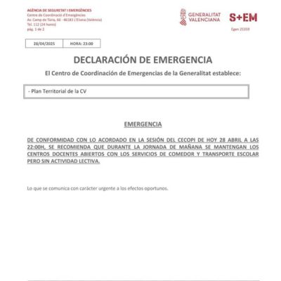 Les informamos que, debido a la situación actual y como consecuencia del apagón ocurrido en el día de ayer, hoy no se llevará a cabo actividad lectiva, siguiendo las indicaciones del Centro de Coordinación Oficial de Emergencias de la Comunidad Valenciana.