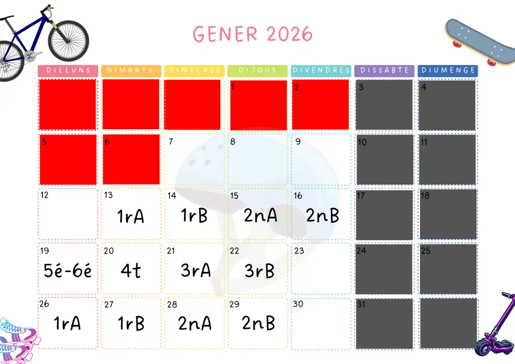 A continuación, podéis consultar los calendarios de uso de las pistas y del taller sobre ruedas: