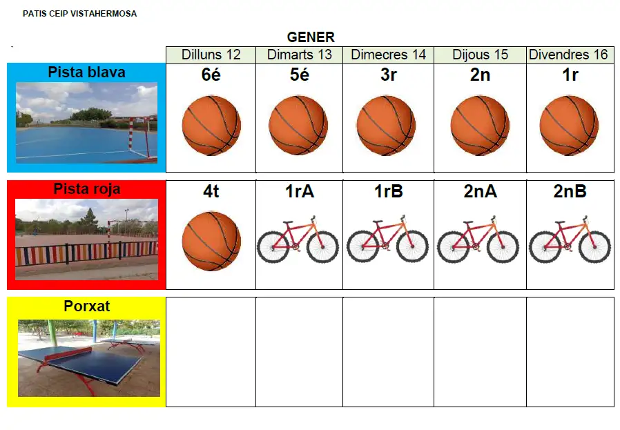 Por un lado, se establece un calendario semanal para el uso de las pistas deportivas y, por otro lado, se habilitan varios rincones por todo el patio abiertos a todo el alumnado.