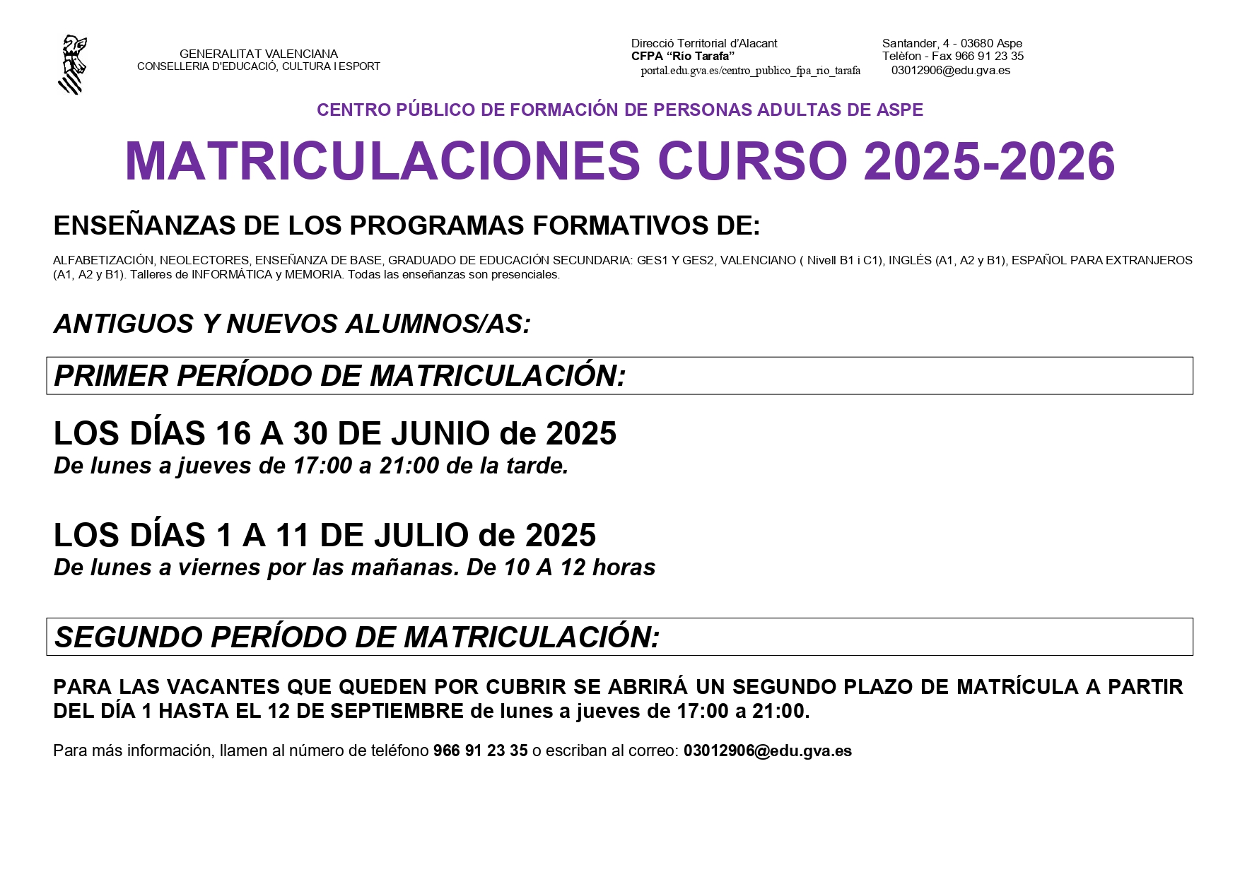 El periodo de matrícula de septiembre será desde el día 2 al 12 de septiembre, de lunes a jueves en horario de 17:00 a 21:00 horas.