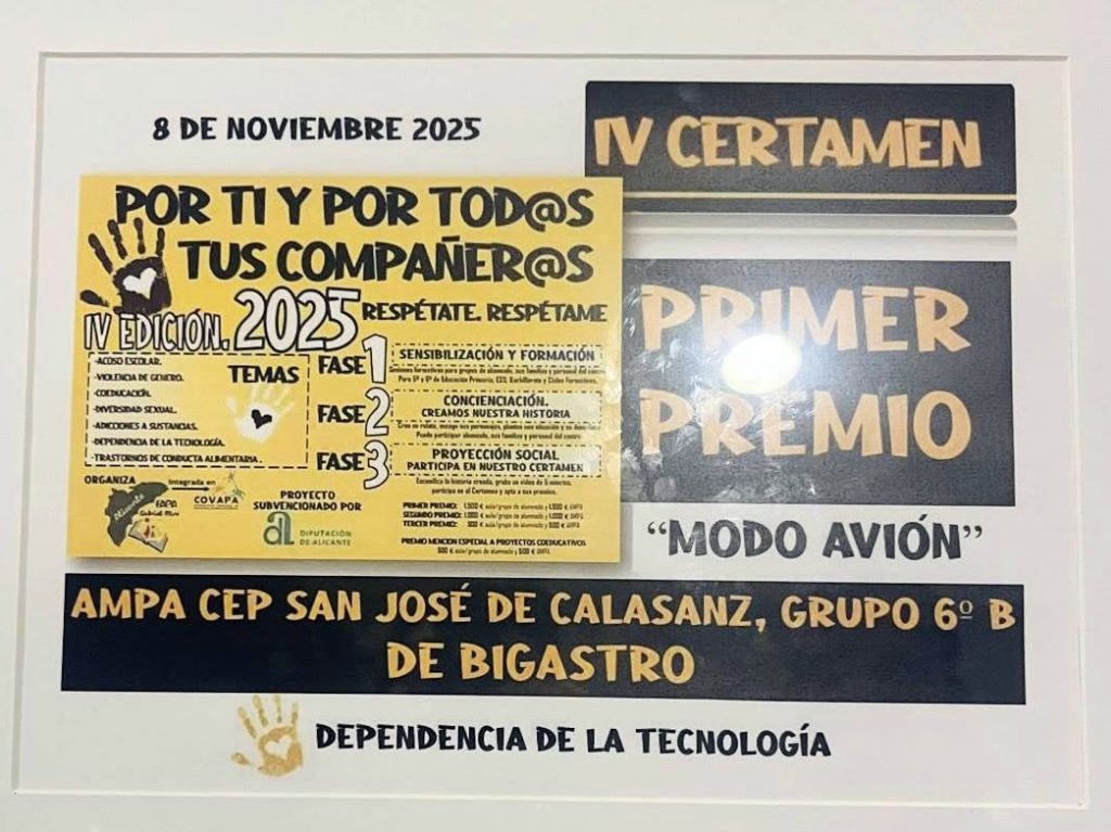 En el mismo congreso de la FAPA Gabriel Miró, se le ha otorgado al vídeo sobre dependencia tecnológica Modo avión, grabado por los alumnos de 6ºB, el primer premio del IV Certamen “Por ti y por tod@s tus compañer@s”.