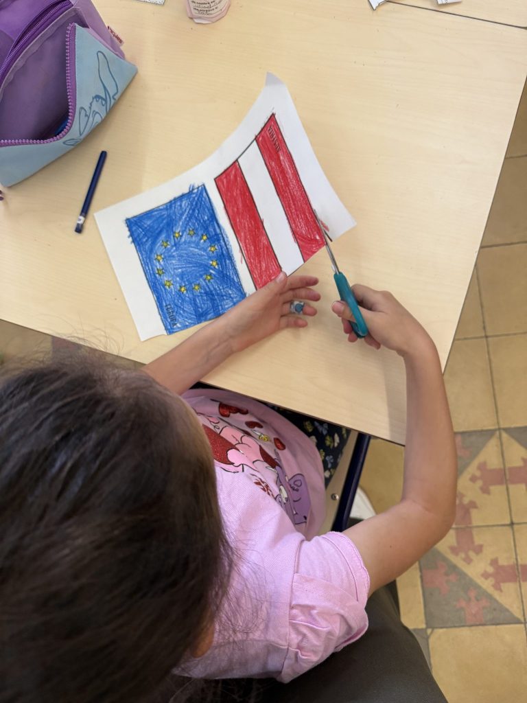 Con estas banderas nos preparamos para la llegada de nuestros amigos de Austria que visitarán nuestro cole la próxima semana.