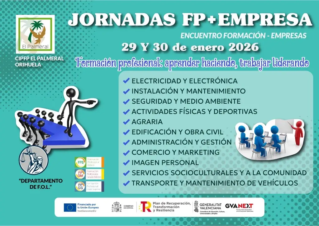 Durante los próximos días 29 y 30 de enero, se celebran en el CIPFP El Palmeral las Jornadas FP+Empresa 25/26. Estas Jornadas están enfocadas a estrechar las relaciones entre las empresas del entorno y el centro educativo. Se han agendado durante estos días diferentes actividades, charlas, ponencias y/o talleres, en los que las empresas transmiten al alumnado y profesorado del centro las últimas novedades en los diferentes sectores productivos y de servicios. En estas jornadas participan todas la Familias Profesionales presentes en el centro, y muchas empresas interesadas en mostrar sus trabajos y captar al talento y trabajadores futuros.