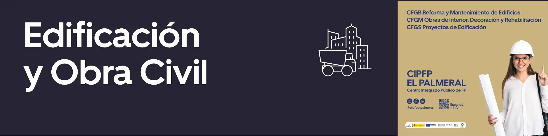 En el Hall del CIPFP El Palmeral podrás observar toda la oferta formativa que ofrecemos gracias a la nueva cartelería que hemos diseñado, dentro de las 11 familias profesionales presentes en nuestro centro, desde ciclos de FP básica, grado medio, grado superior y cursos de especialización. Este trabajo ha sido posible gracias a la financiación … Leer más - Docentes franceses visitan el CIPFP El Palmeral para compartir proyecto en el marco de Erasmus+ con alumnado de la familia profesional de Edificación y Obra Civil.