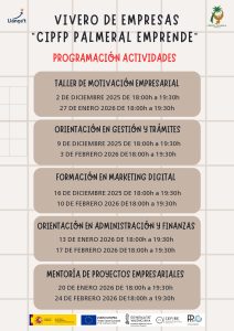 Os compartimos el programa de sesiones formativas que se llevarán a cabo en el CIPFP El Palmeral para todos/as los inscritos en el programa Llança’t (Vivero de empresas). Os recordamos que todavía estamos reclutando a titulados de FP (grado medio y superior) que quieran participar en este proyecto de fomento del emprendimiento desde la FP. … Leer más