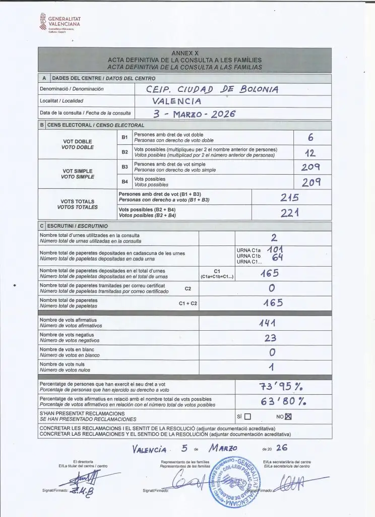 A continuación publicamos el acta definitiva de escrutinio de consulta a las familias, tal y como establece la Orden ORDEN 9/2022, de 25 de febrero, de la Conselleria de Educación, Cultura y Deporte, por la que se regulan las condiciones y el procedimiento de solicitud y de autorización de modificación de la jornada escolar en los centros sostenidos con fondos públicos de segundo ciclo de Educación Infantil y de Educación Primaria.