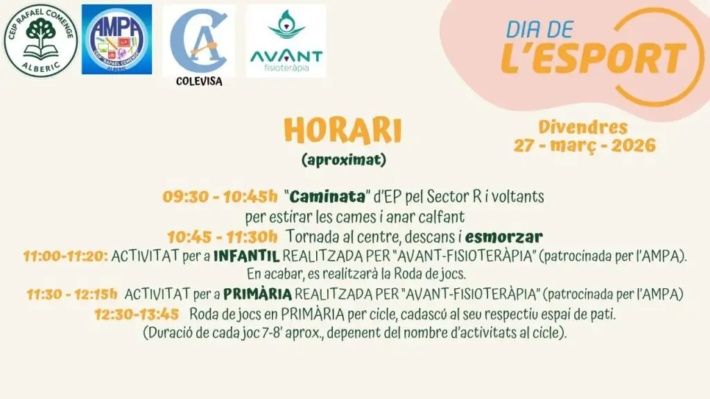 Les famílies que participeu en la caminata, recordeu: – Anireu al final del grup de la caminata, tancant el grup, no entre el grup dels vostres fills/es – No es poden fer fotos per tal de no ralentizar la caminata. – Els i les mestres són els encarregats de vigilar – És una activitat per passar-ho bé i gaudir d’un dia junts, fent escola. Vos agraïm la vostra participació, obrim l’escola per participar tots i totes en les activitats educatives dels nostres fills i filles. Entre totes i tots farem un dia per recordar amb alegria!