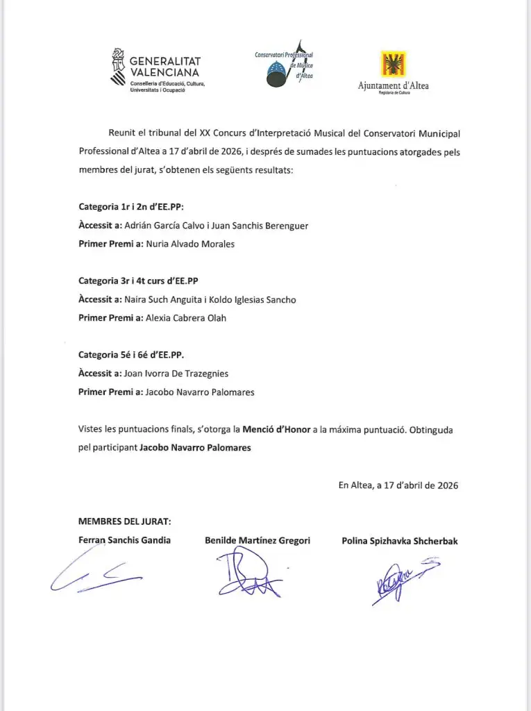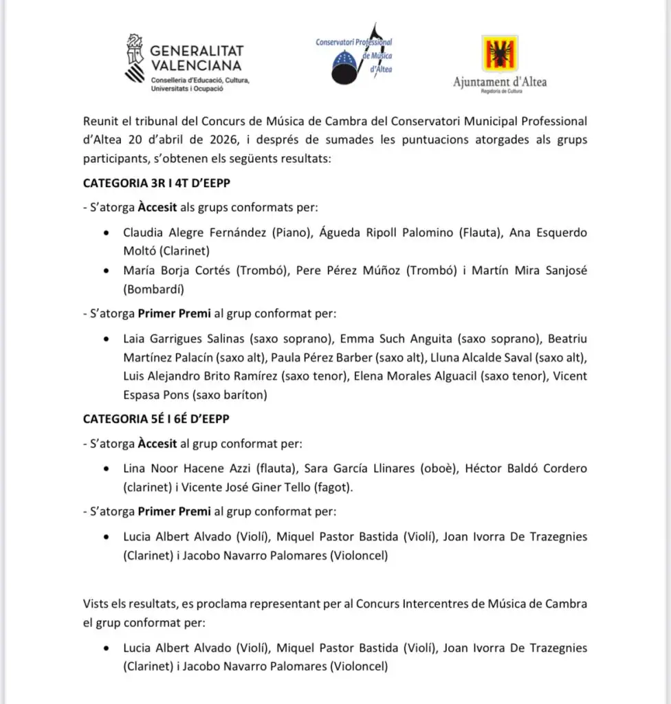 Enhorabuena a todos los participantes: Alexia Cabrera, violín, Jacobo Navarro, violonchelo, Lucia Alvado, violín, Miquel Pastor, violín, Joan Ivorra, clarinete, y Nuria Alvado, piano, que obtuvo en la categoría de 1 y 2 de Enseñanzas Profesionales el Primer Premio.