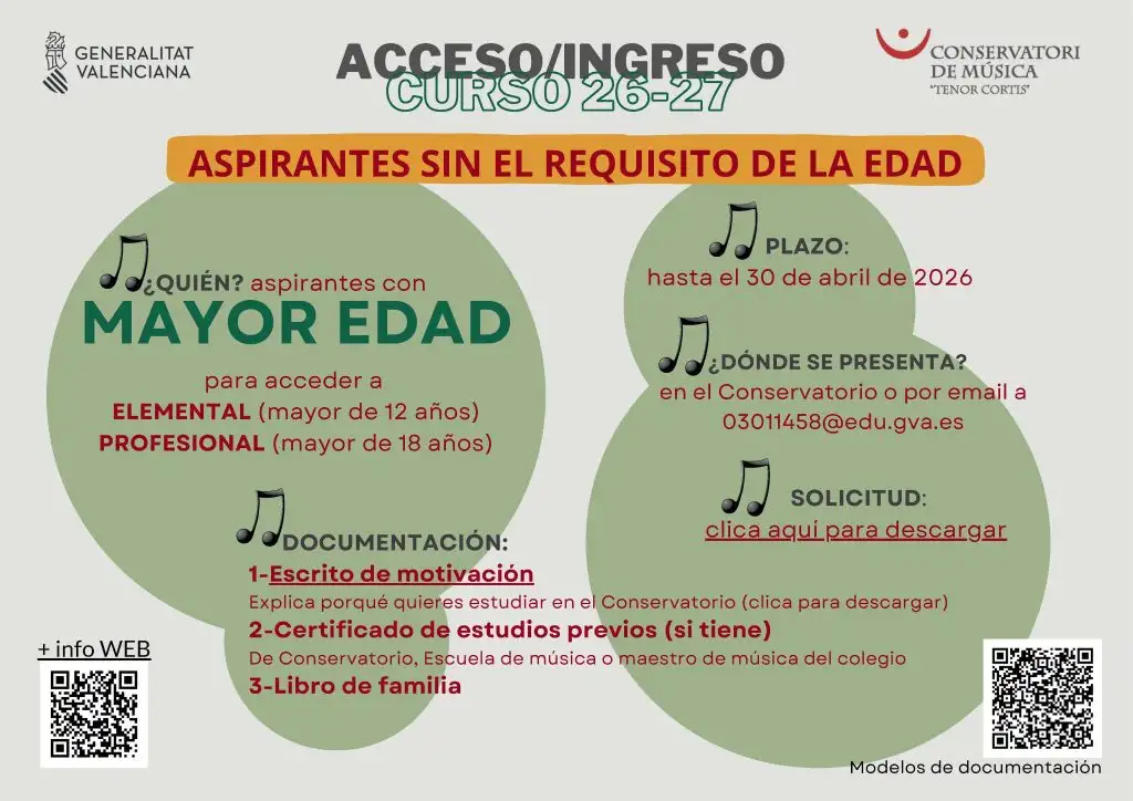 Los aspirantes con edades superiores (Enseñanzas Elementales mayores de 12 años, Enseñanzas Profesionales mayores de 18 años) a las fijadas con carácter ordinario, según establece el artículo 2 de la Orden 28/2011, de 10 de mayo, podrán solicitar autorización para presentarse a las respectivas pruebas de ingreso o de acceso, tanto en el primer curso como cursos diferentes del primero, de las enseñanzas elementales o profesionales de Música.
