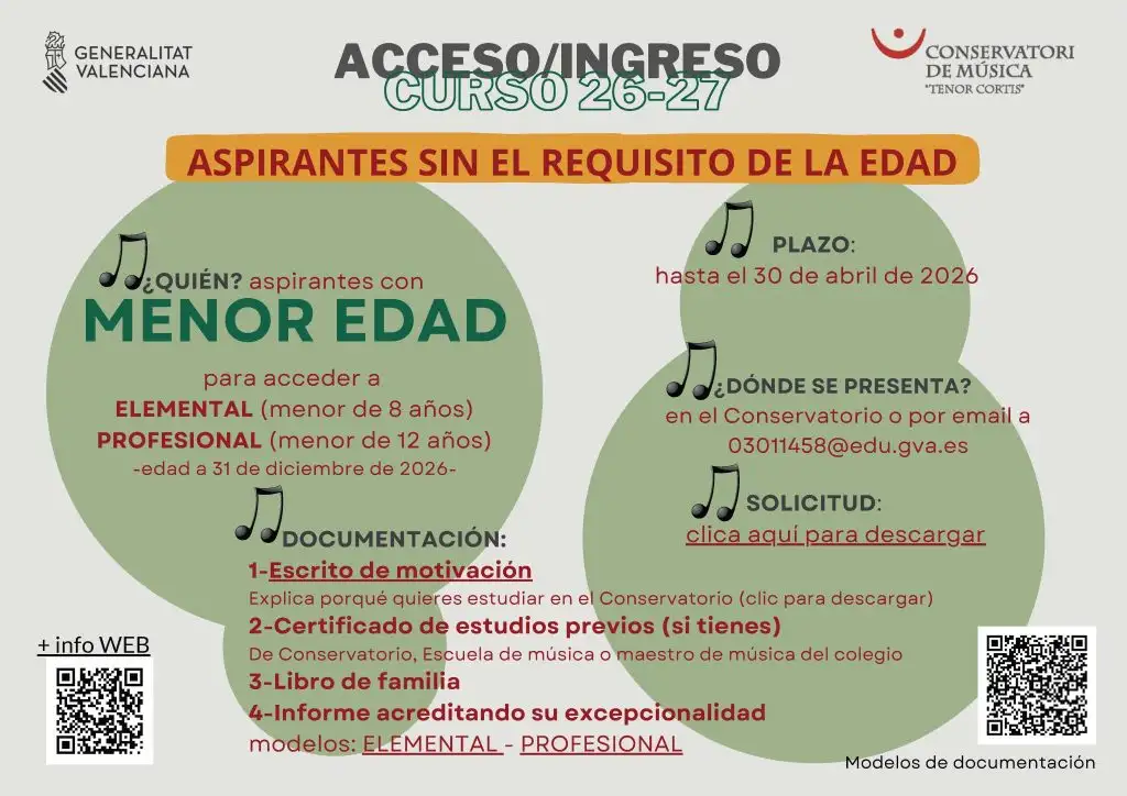 Los aspirantes con edades inferiores a las fijadas con carácter ordinario (Enseñanzas Elementales de 8 a 12 años y Enseñanzas Profesionales de 12 a 18 años), según establece el artículo 2 de la Orden 28/2011, de 10 de mayo, para iniciar las enseñanzas elementales o profesionales de Música, o bien para acceder a cursos diferentes del primero, tendrán que obtener la autorización para concurrir a las pruebas de ingreso o de acceso, respectivamente.