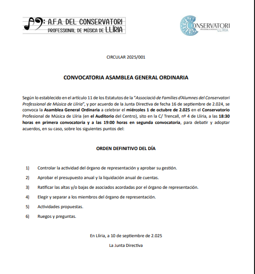 La Associació de Famílies d’Alumnes del Conservatori Professional de Música de Llíria és una organització sense ànim de lucre que té com a objectiu secundar i fomentar la formació musical dels nostres fills i filles, així com contribuir al desenvolupament del Conservatori i a la difusió de la cultura musical en la societat.