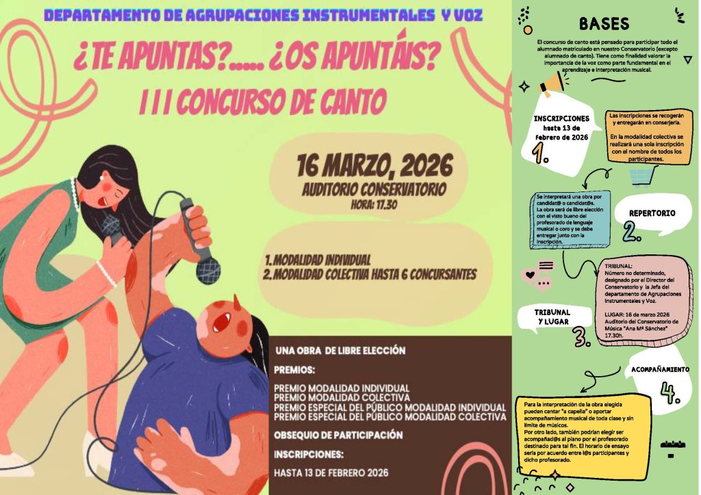 • Canto, Clarinet, Flauta travessera, Oboé, Fagot, Saxofon, Tuba, Trombó, Bombardí, Trompa, Trompeta, Viola, Violí, Violoncello, Contrabaix, Guitarra, Piano, Percussió.