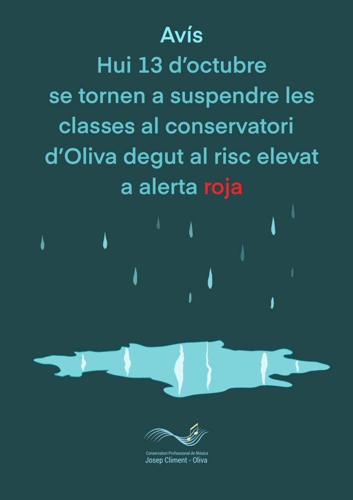 Hui dia 13 d’Octubre és tornen a suspendre les clases al Conservatori degut a les fortes pluges què han fet que el nivell d’ alerta s’eleve a roja - Sorteig eleccions al Consell Escolar