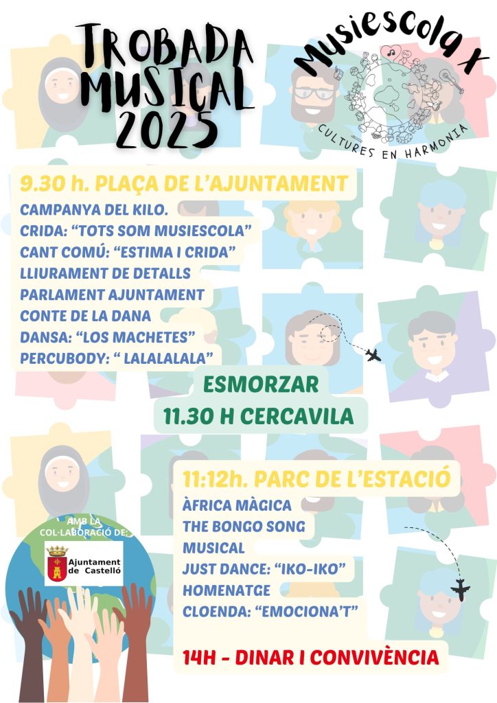 El pròxim dimarts dia 13 de maig els xiquets i xiquetes de 5é i 6é participaran en la trobada de Musiescola. La jornada començarà a la plaça de l’ajuntament de Castelló de la Ribera a les 9:30 lloc on es realitzaran les primeres activitats. Després de l’esmorzar, ens desplaçarem a ritme de batucada que realitzarà el mateix alumnat fins al parc de l’estació. Al parc, ens esperarà l’orquestra La Pato amb la que realitzarem el musical i més activitats. A les 14h serà el moment per a dinar i convivència de l’alumnat. Més avall podeu consultar el programa d’activitats.
