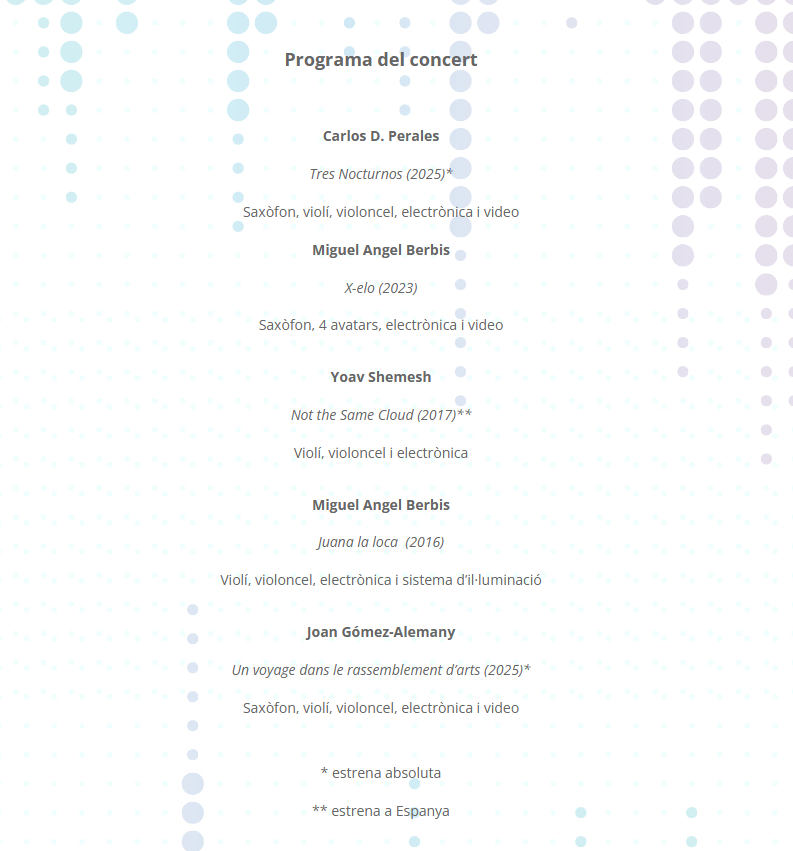 En el concert es varen escoltar obres de Carlos D. Perales, Miguel Ángel Berbis, Yoav Shemesh i Joan Gómez-Alemany. El programa del concert va ser el següent: