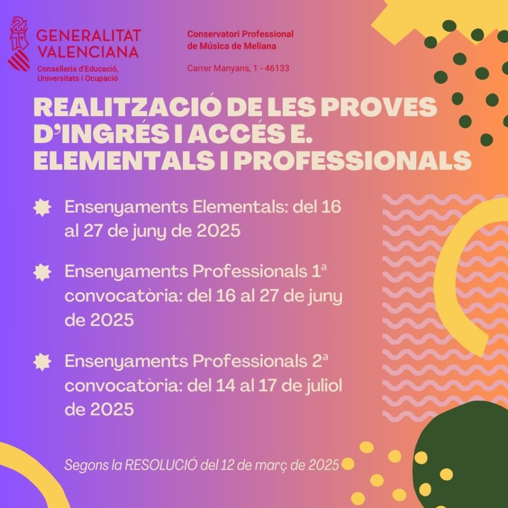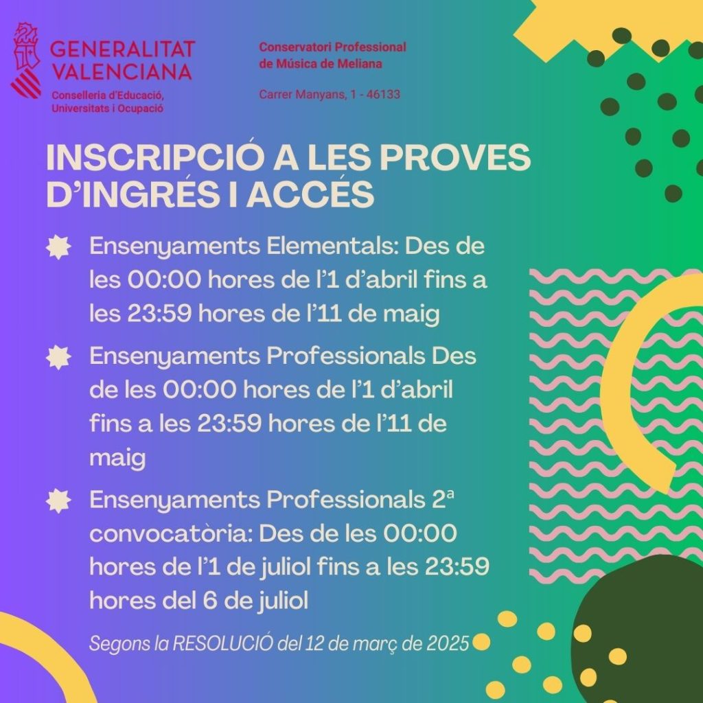 - Ensenyaments Elementals (ATENCIÓ: L’aplicació de Conselleria per a inscriure’s no mostra com a opció el conservatori de Meliana, Està previst que els pròxims dies esta incidència estiga resolta.)