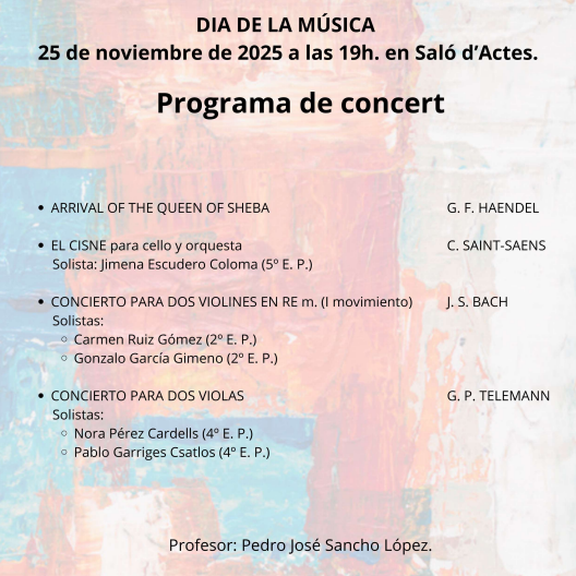 El programa presentava diferents obres de G. F. Haendel, C. Saint-Saëns, J. S. Bach i G. P. Telemann per a solistes baix la direcció del professor Pedro J. Sancho. Com a instruments solistes varen actuar Jimena Escudero, cello de 5é EE.PP., Carmen Ruiz i Gonzalo García, els dos violinistes de 2n d’EE.PP. i Nora Pérez i Pablo Garrigues., violes de 4t EE.PP.