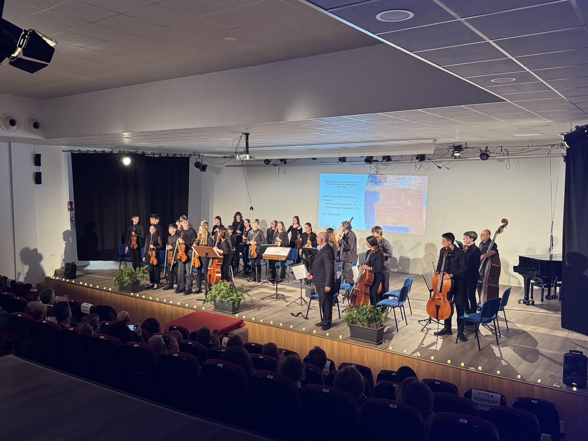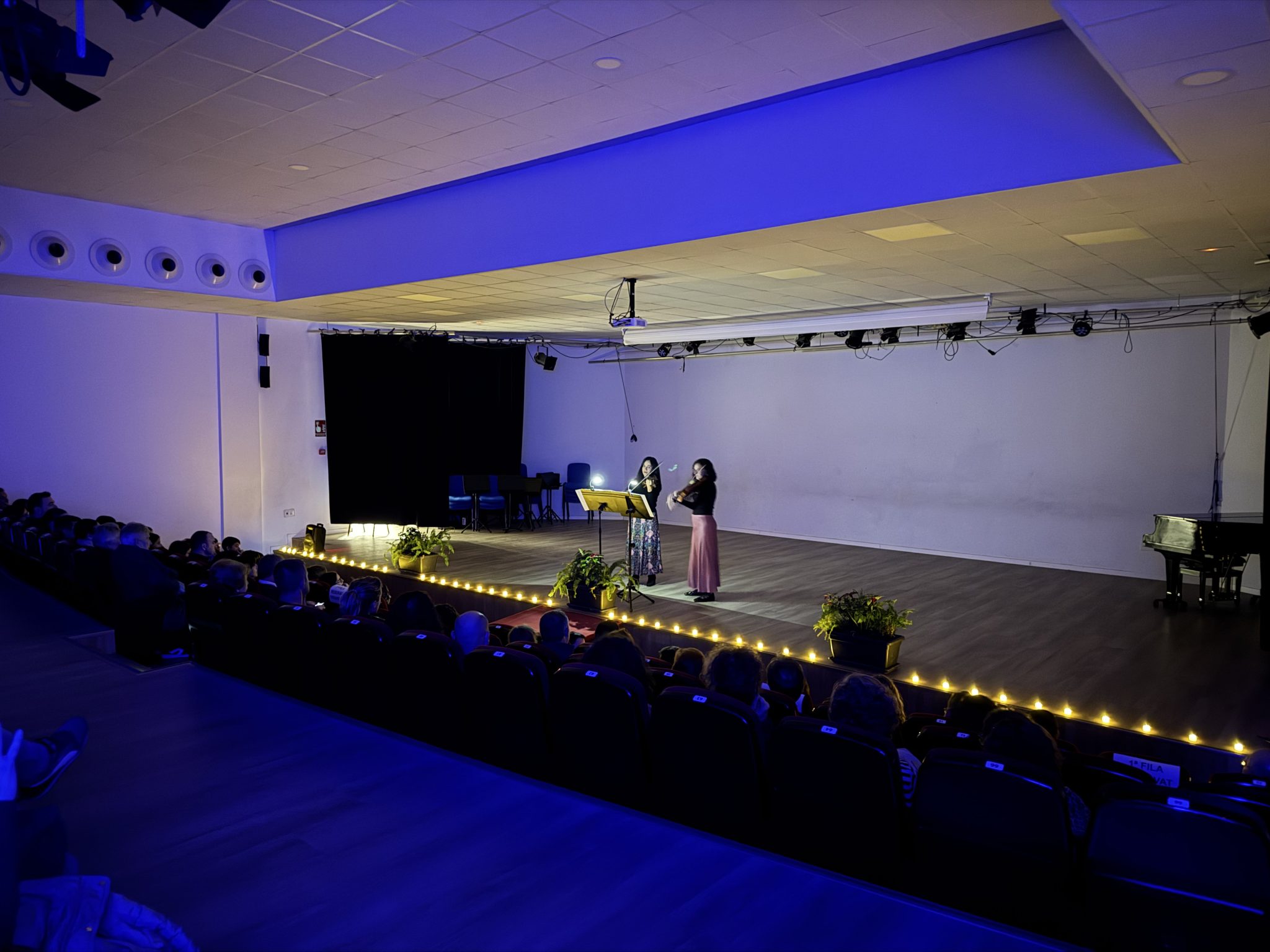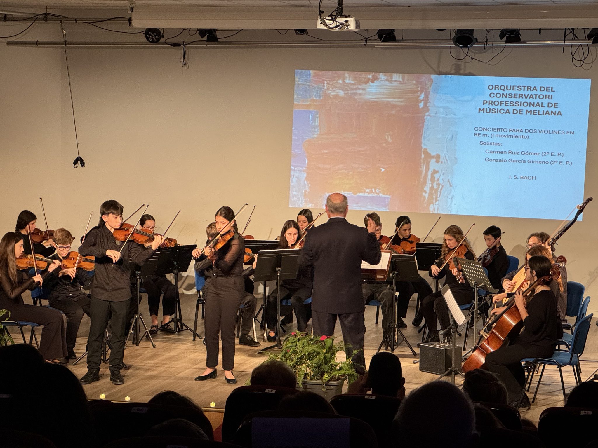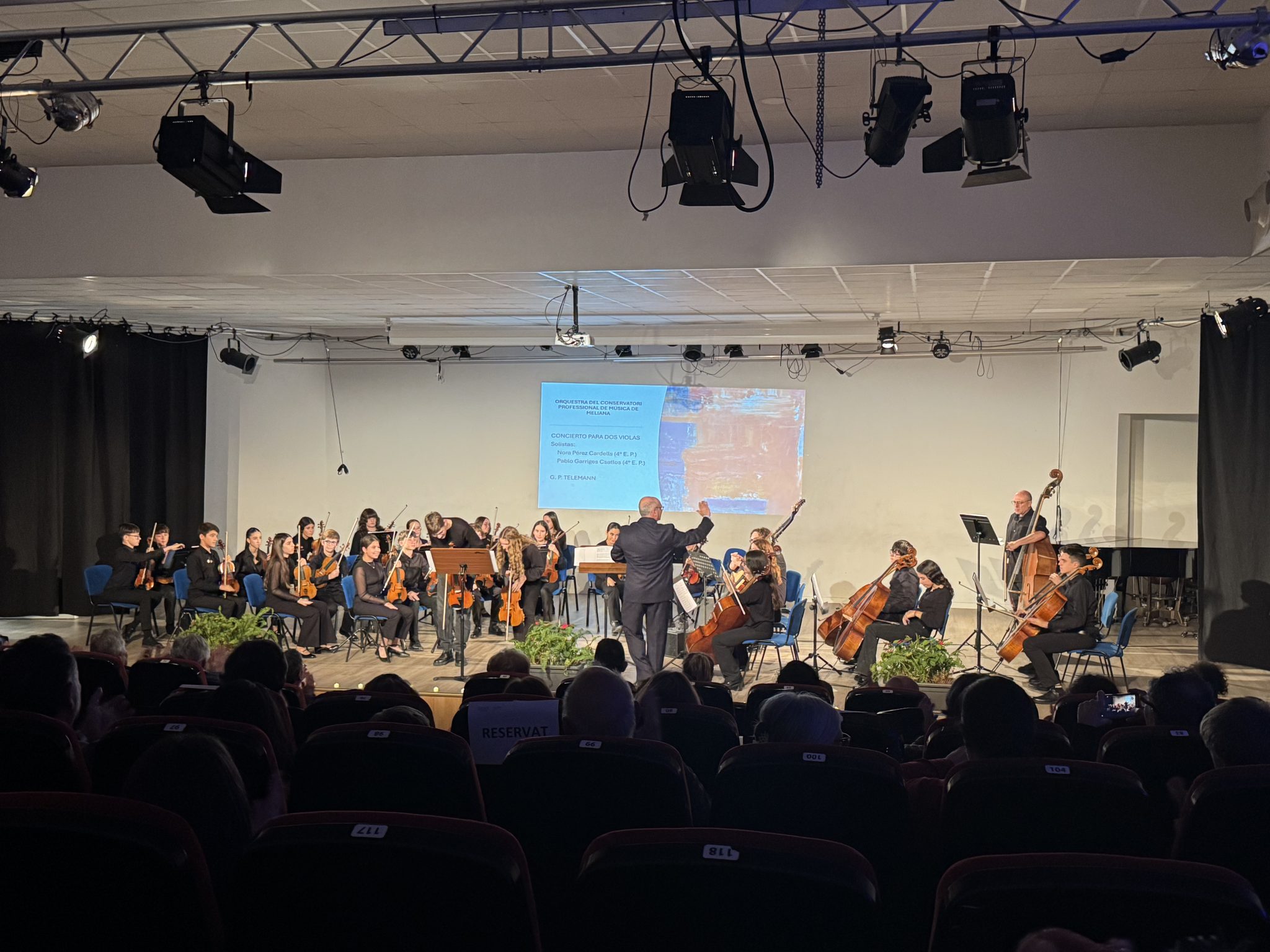 L’acte va començar amb la intervenció de les professores Patricia Genís i M. Carmen Moros amb una peça de Sibelius, més concretament el Duo en C Major.