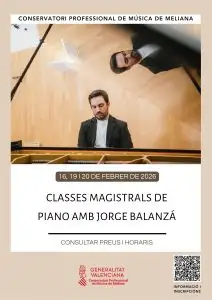 Els dies 16, 19 i 20 de febrer de 2026 se realitzaran classes magistrals de piano amb Jorge Balanzá en el Conservatori destinat a tots els cursos. Horari: Preus: Accés al formulari: ACÍ Data màxima per a pagar …
