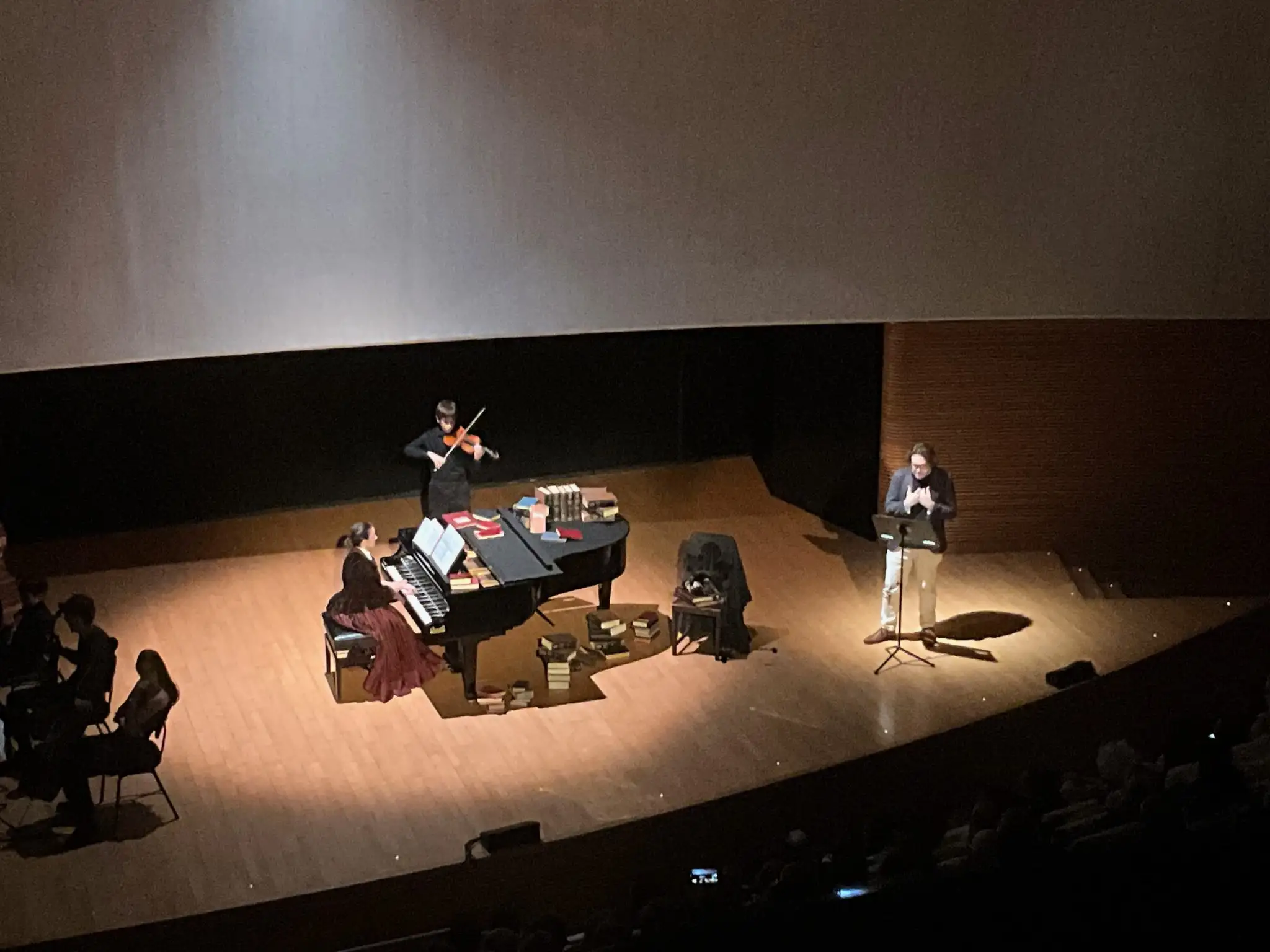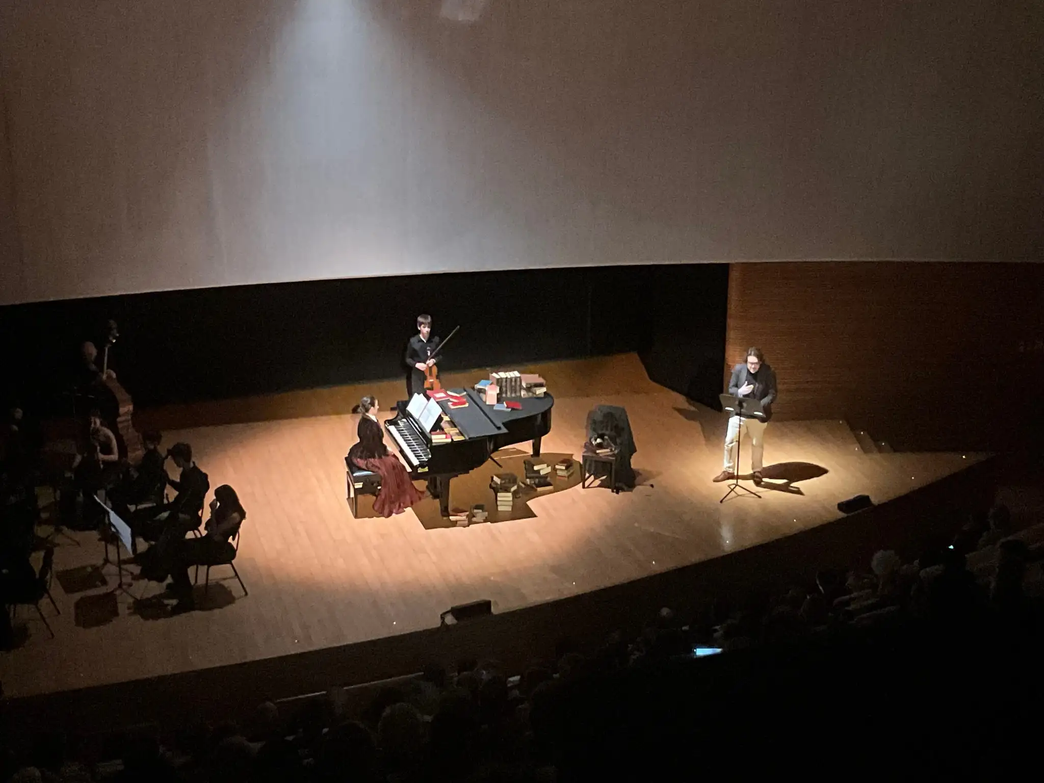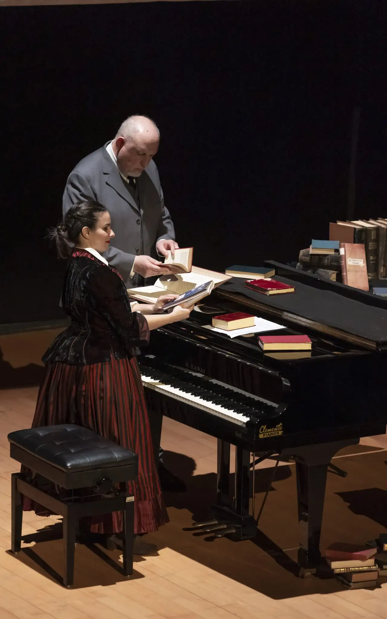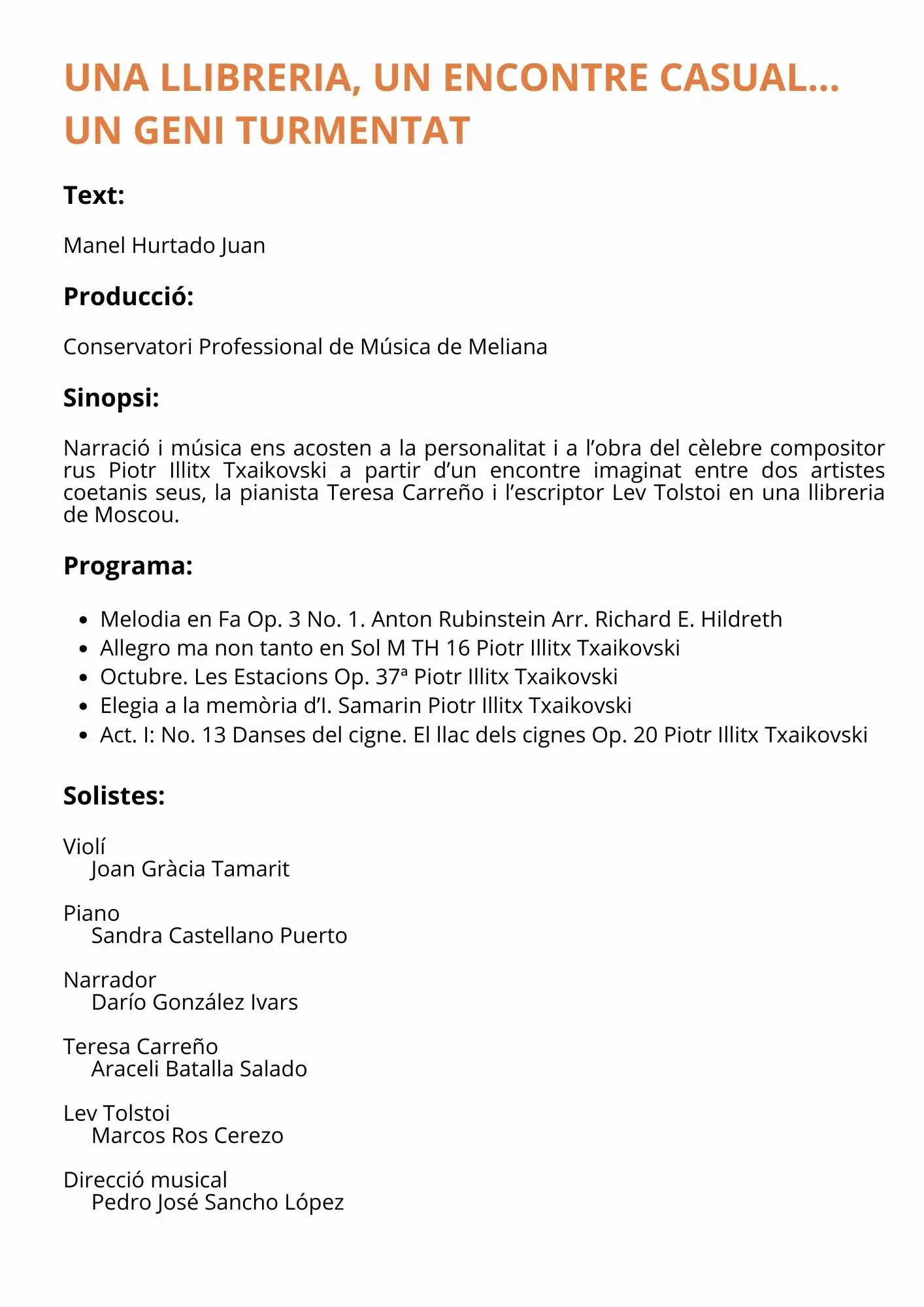 Una llibreria, un encontre casual… un geni turmentat interpretat per l’alumnat i professorat del Conservatori era una lectura dramatitzada amb música. Amb un text escrit per Manuel Hurtado Juan, narració i música ens acosten a la personalitat i a l’obra del cèlebre compositor rus Piotr Illitx Txaikovski a partir d’un encontre imaginat entre dos artistes coetanis seus, la pianista Teresa Carreño i l’escriptor Lev Tolstoi en una llibreria de Moscou.