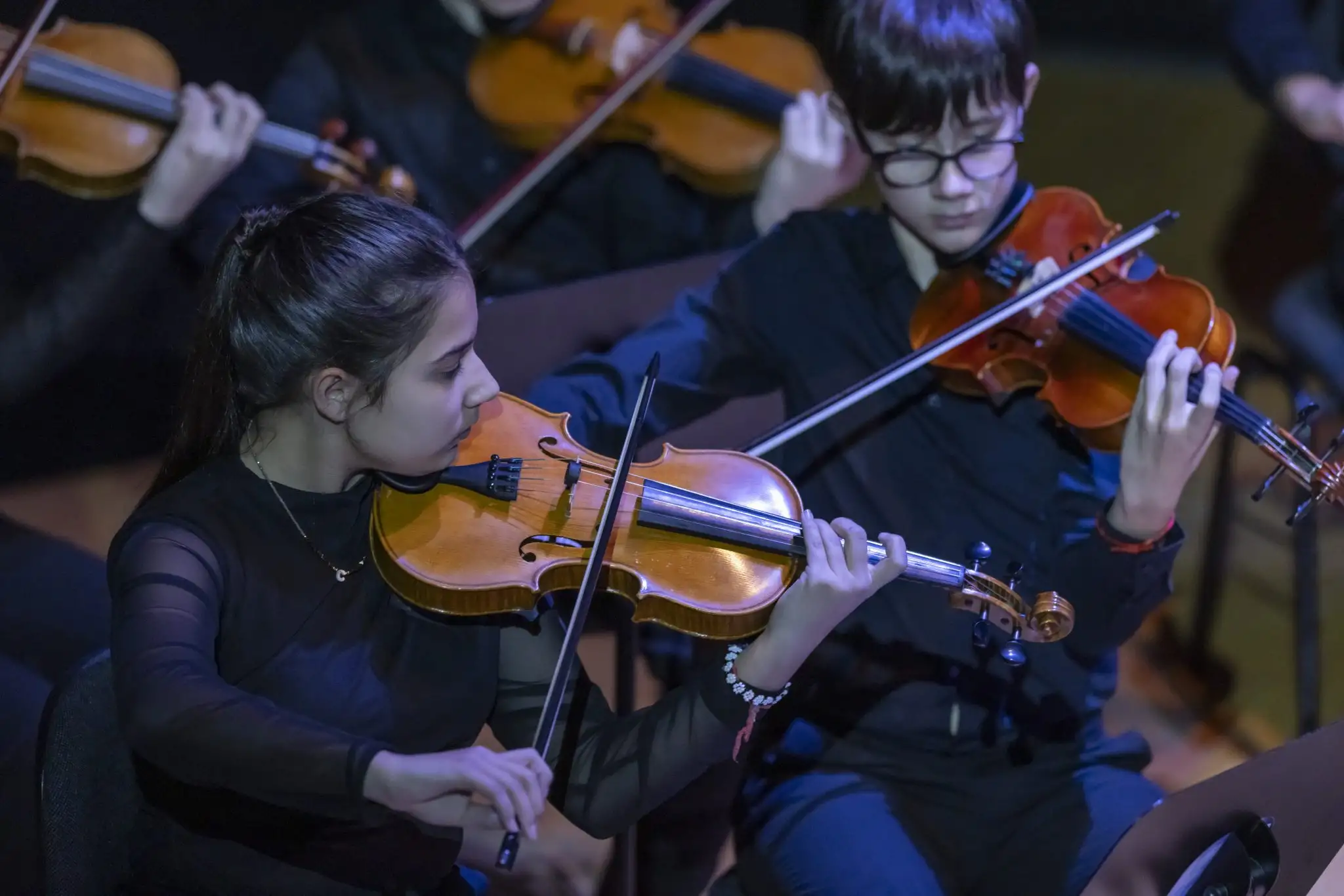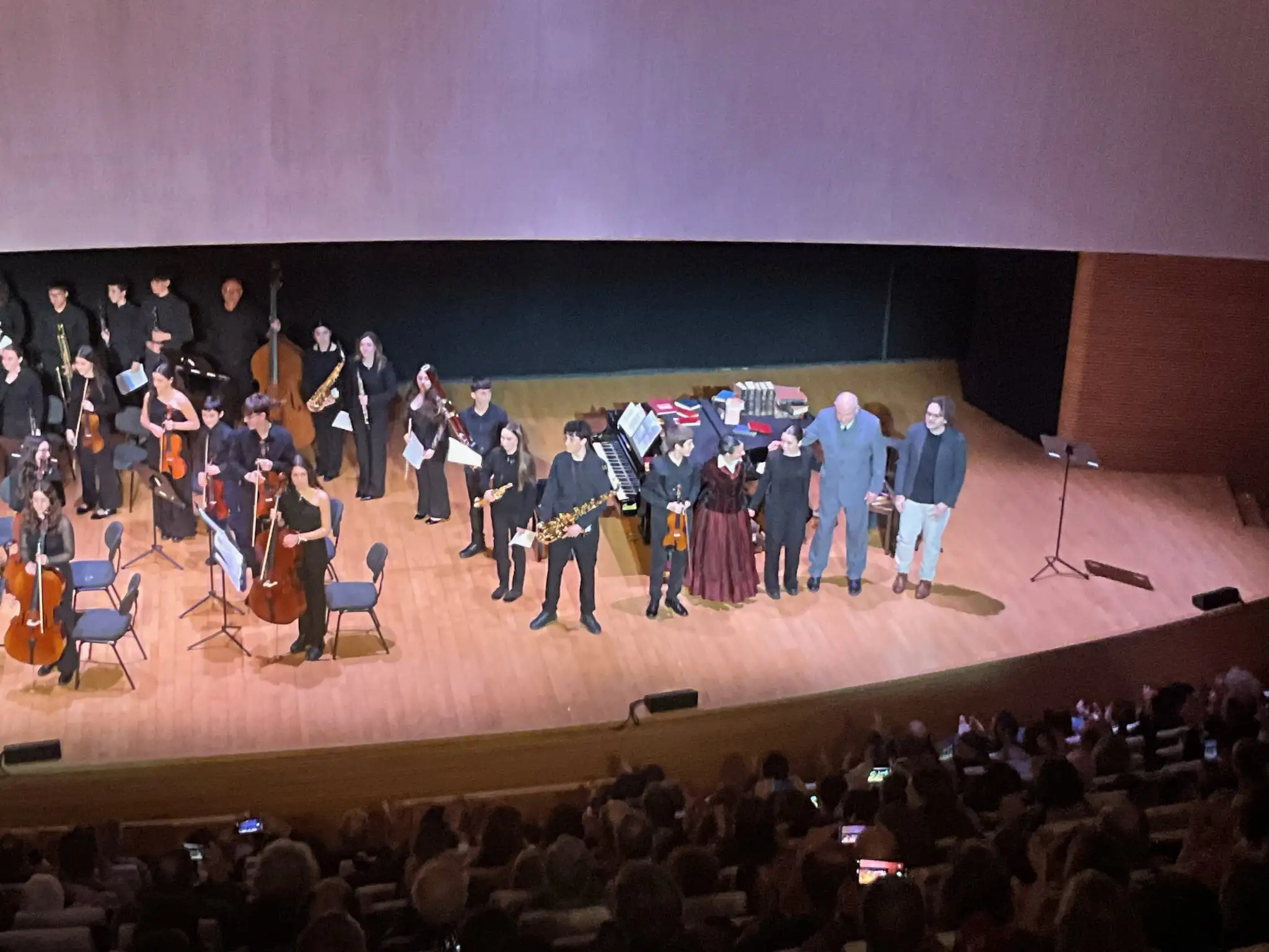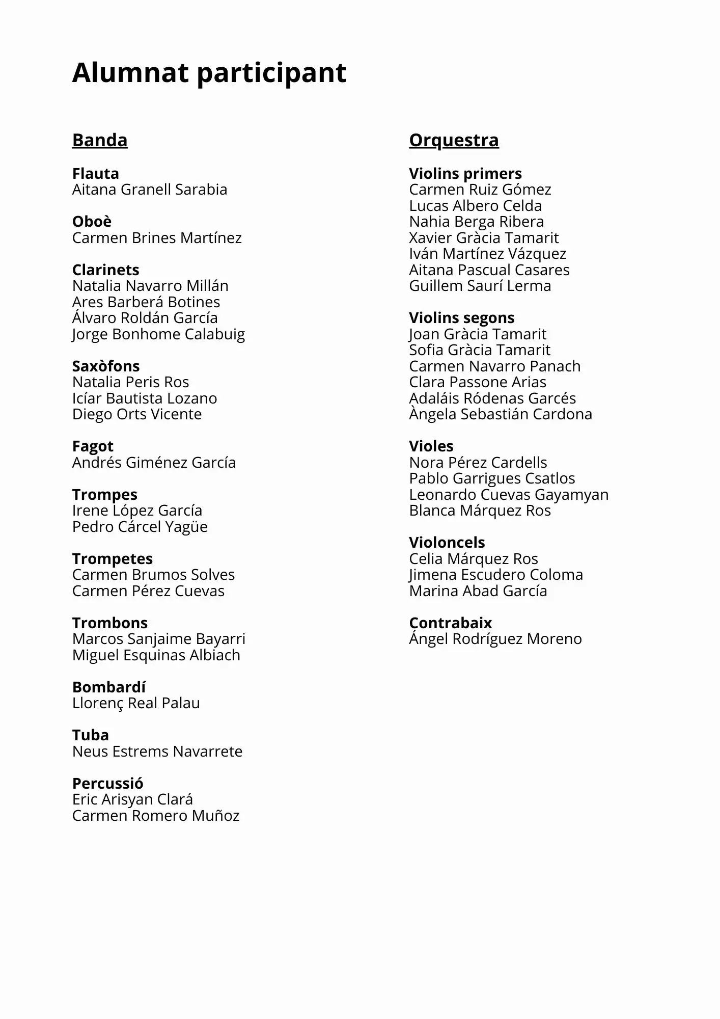 En la representació varen actuar alumnat de banda, d’orquestra, així com solistes: Sandra Castellano (piano) i Joan Gràcia (violí). També es va comptar amb la col·laboració de professorat: Dario González (narrador), Araceli Batalla (Teresa Carreño), Marcos Ros (Tolstoi).