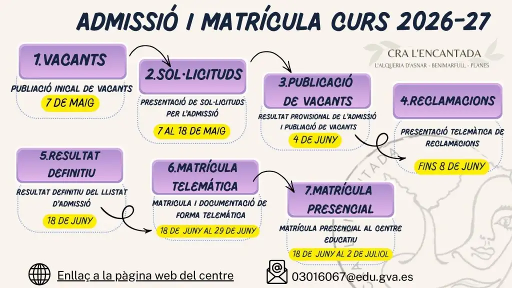 – S’ha d’accedir a la pàgina web de la Conselleria d’Educació par a omplir el formulari electrotònic de sol·licitud d’admissió del 7 al 18 de maig de 2026.