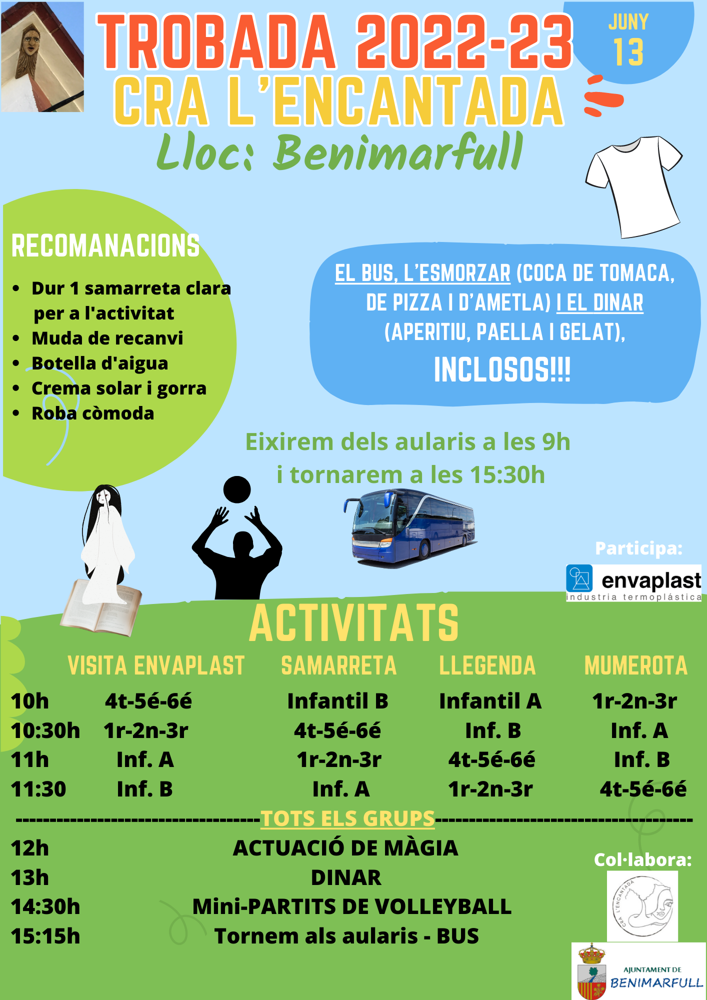 El dimarts 13 de juny, celebrarem la trobada del CRA L’Encantada en la població de Benimarfull. Passarem un dia junts de 9 del matí a 15:30h de la vesprada. Realitzarem activitats, jocs, rutes, partits de voleibol i més. A més, contarem amb l’actuació d’un mag. Serà una jornada de convivència molt divertida.