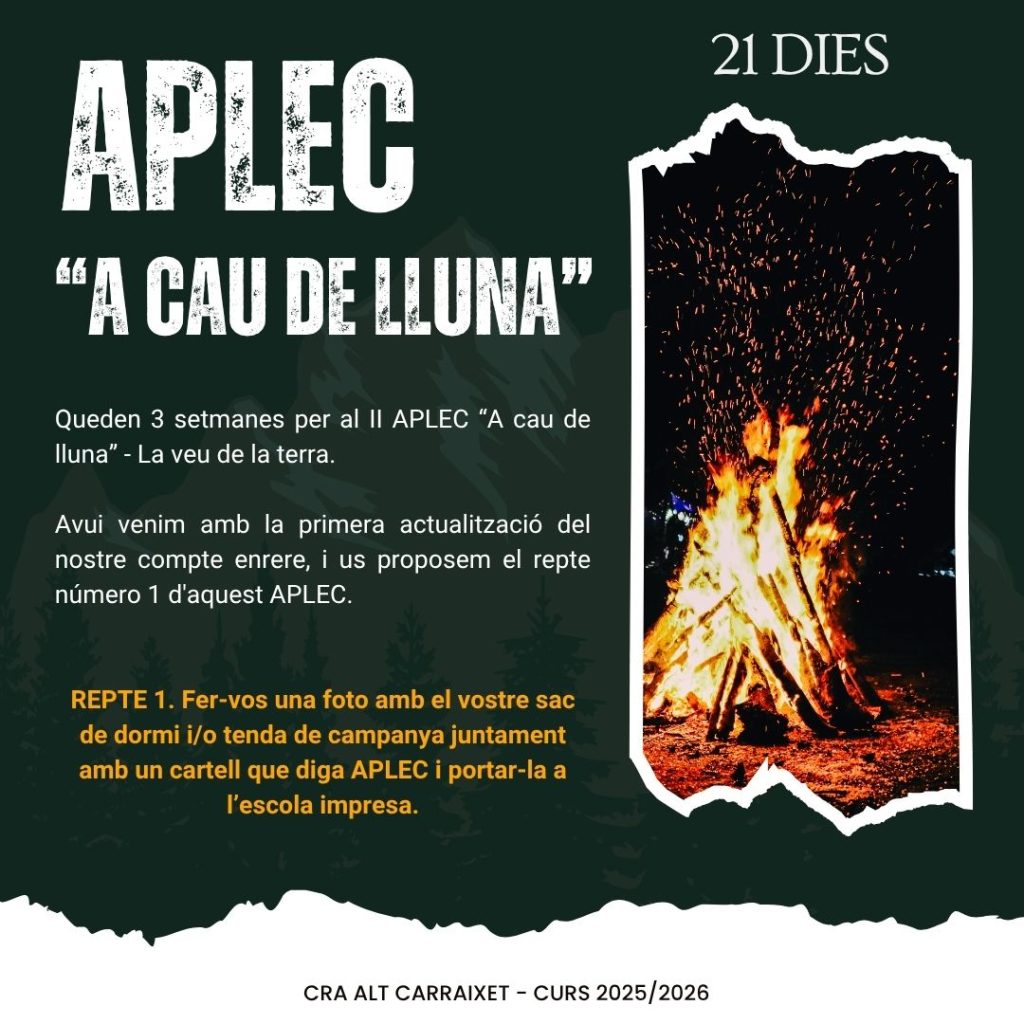Hola, famílies i alumnat. Avui us proposem el primer repte del nostre compte enrere: Fer-vos una foto amb el vostre sac de dormi i/o tenda de campanya juntament amb un cartell que diga APLEC i portar-la a l’escola impresa aquesta setmana en tamany A5 -mig full-..