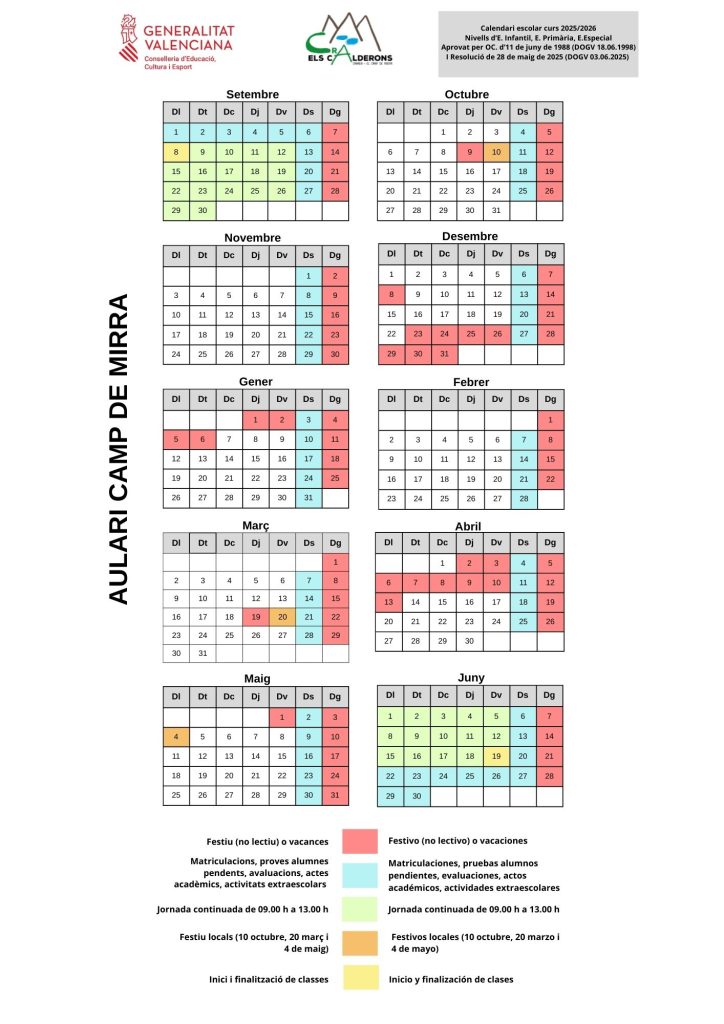 - Vacaciones de Navidad: del 23 de diciembre al 6 de enero (Aulario del Campo de Mirra) y del 23 de diciembre al 7 de enero (Aulario de la Cañada). Ambos incluidos.