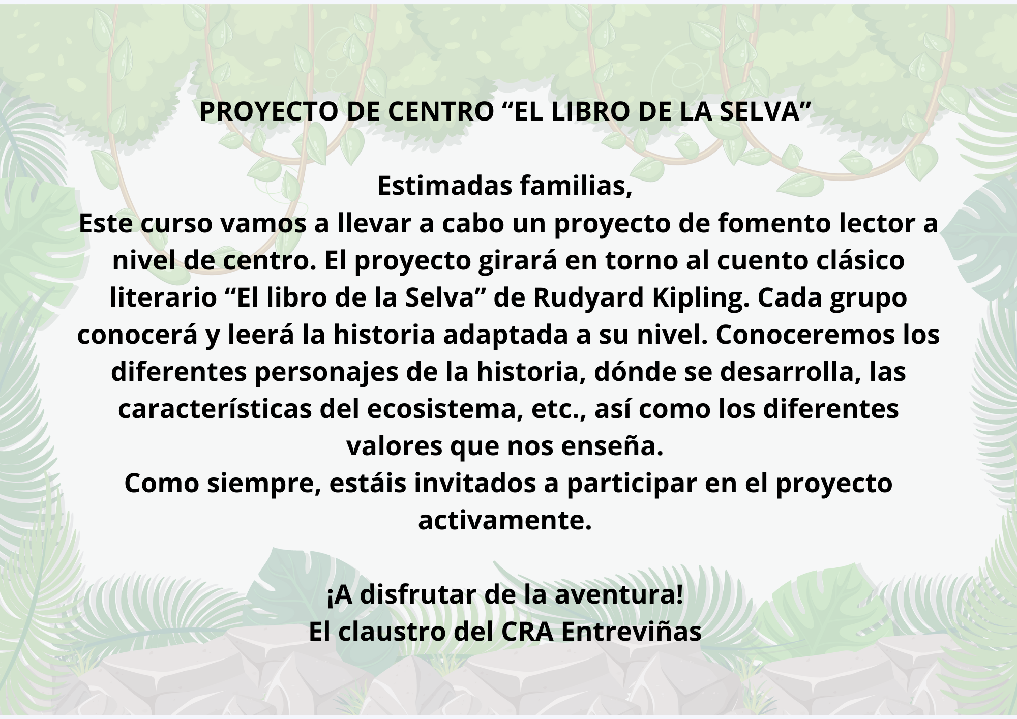 Este curso estamos llevando a cabo el proyecto del «Libro de la Selva» de Rudyard Kipling. A través de este clásico nuestro alumnado conocerá las emocionantes aventuras de los personajes que en él aparecen, investigaremos sobre las características de este ecosistema, así como sus animales y nos ayudará a explorar y aprender unos valores universales como la amistad, el respeto, la identidad, la familia y la convivencia con el entorno.