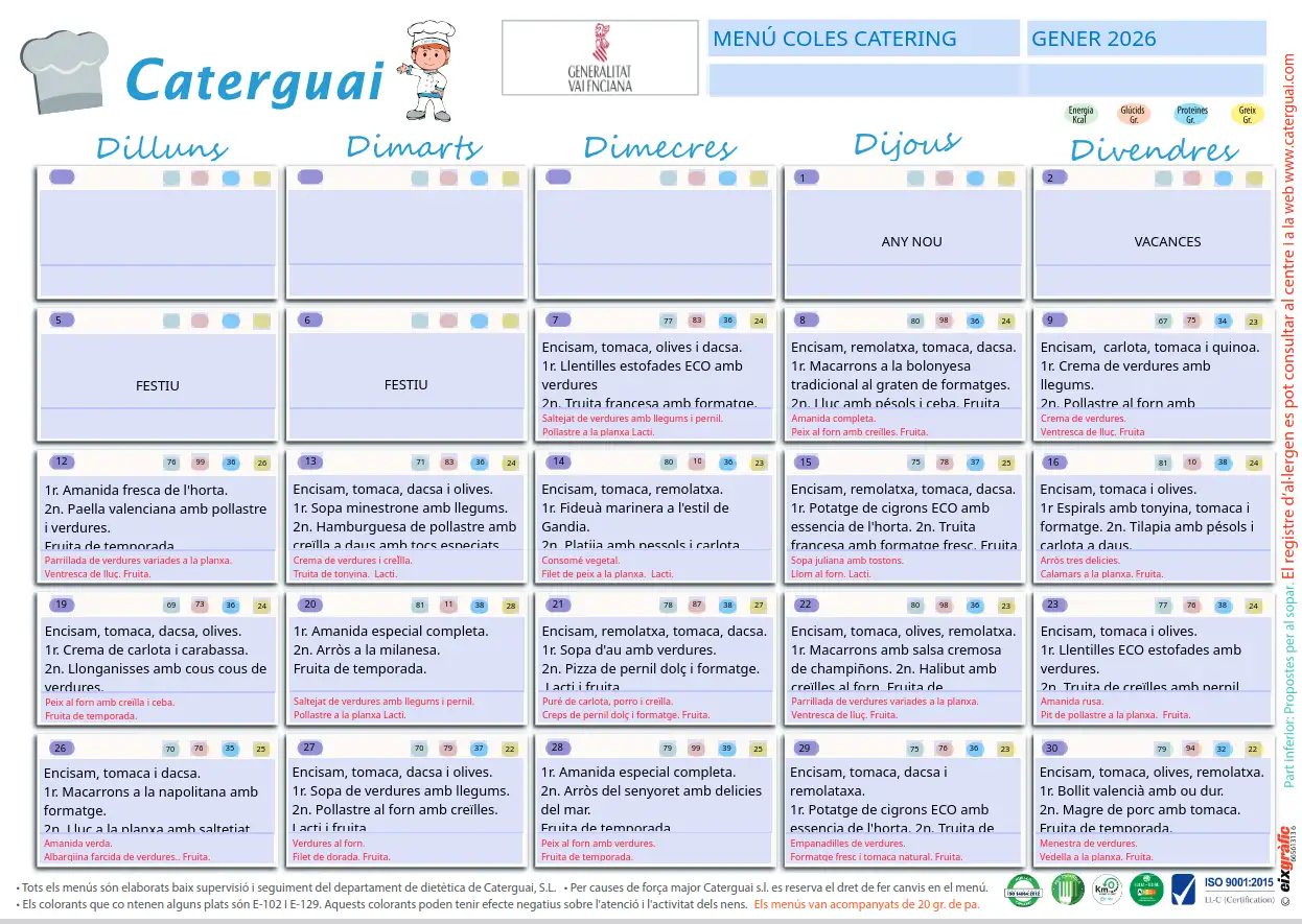 Ací trobareu els menús escolars de cada mes, per a consultar la resta de menús, visiteu la web de Caterguai https://www.caterguai.com