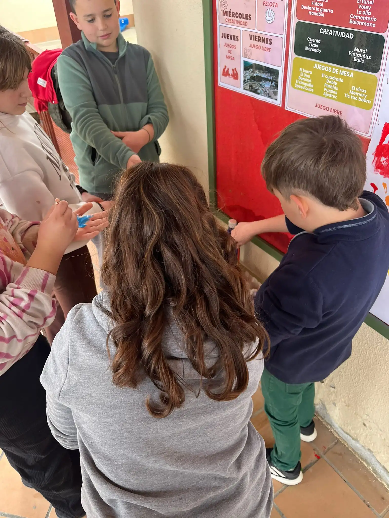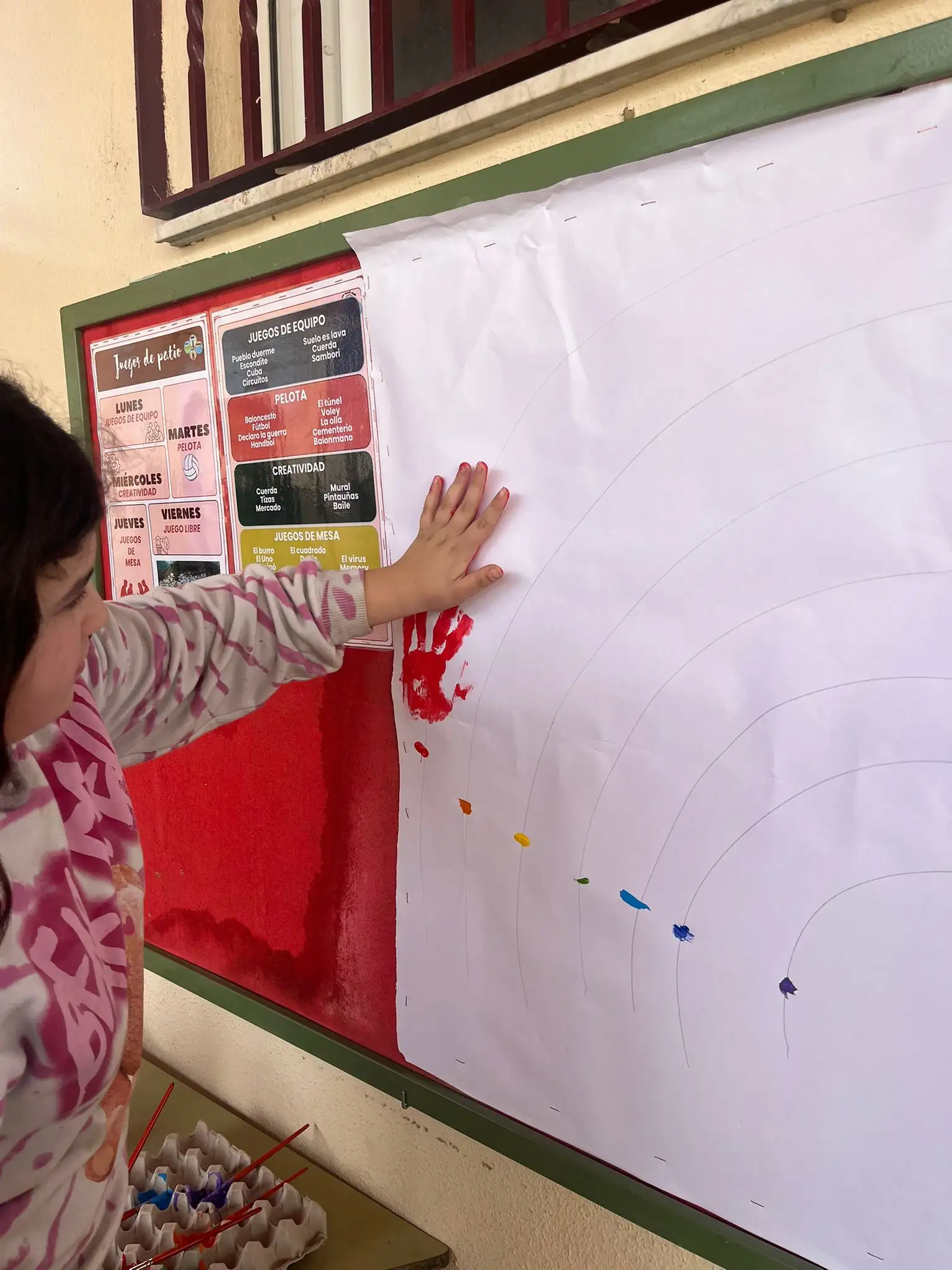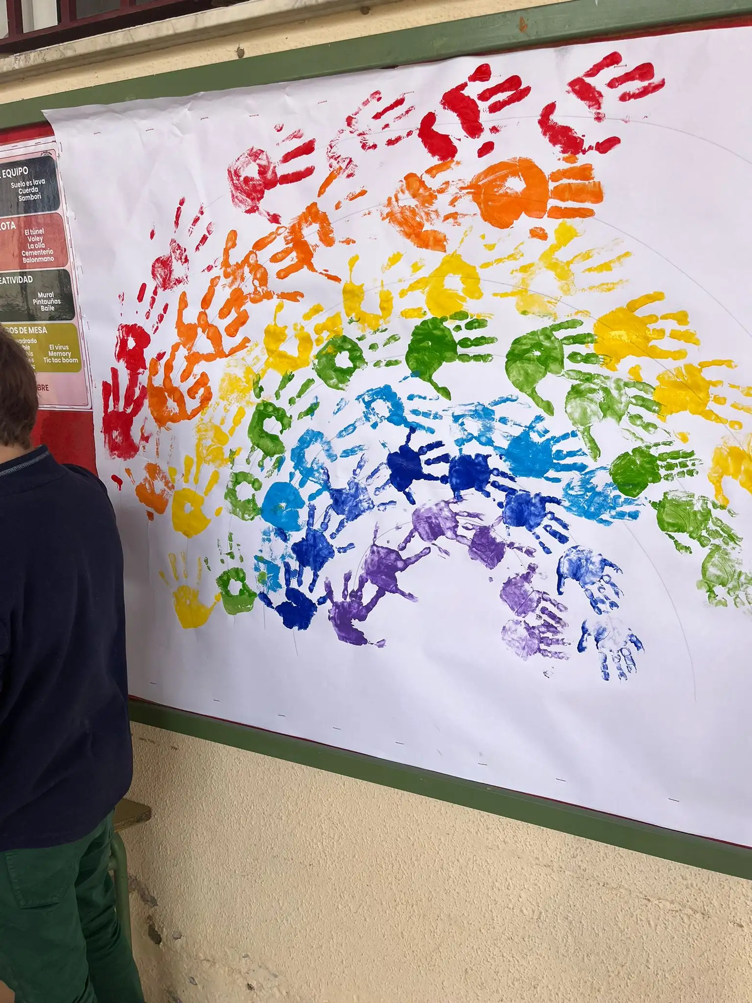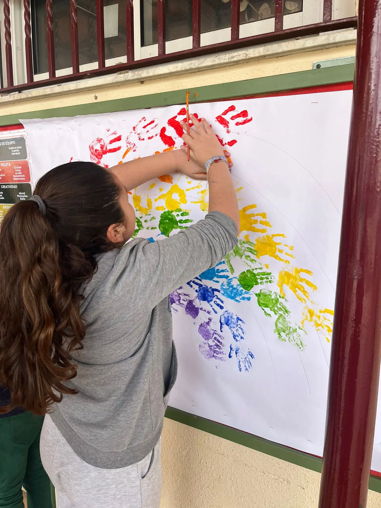 Una de las propuestas más especiales fue la creación de un gran arcoíris formado con las manos de todo el alumnado. Cada niño y niña dejó su huella para construir entre todos este símbolo tan colorido que representa la unión, la convivencia y la esperanza de un mundo en paz.
