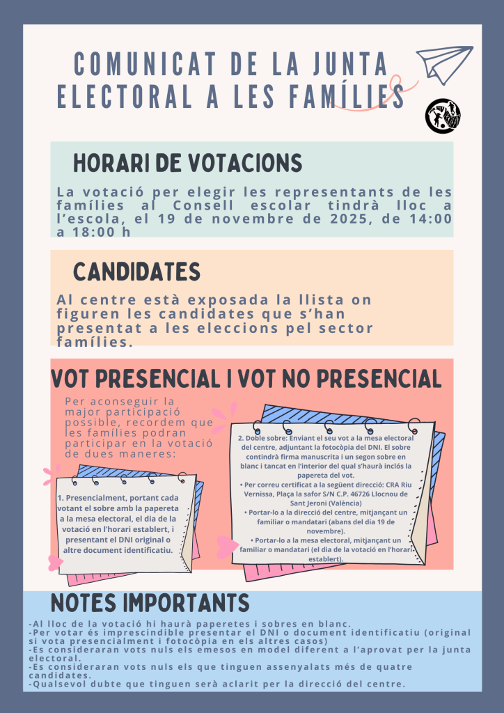 Las elecciones a los consejos escolares son cada dos años renovando una mitad de los miembros elegibles. En el caso de nuestro CRA Riu Vernissa, en estas elecciones corresponde la renovación de la primera mitad de los miembros del consejo escolar, es decir: