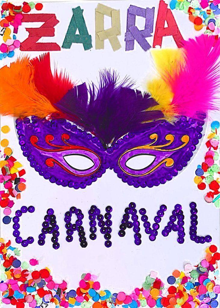Los alumnos de Zarra hemos creado con mucha ilusión y trabajo en equipo la portada del libro de fiestas del Carnaval de Zarra. Para ello, hemos utilizado materiales típicos de esta celebración, como serpentinas, confeti, lentejuelas y plumas, que representan la alegría y el espíritu festivo del Carnaval.