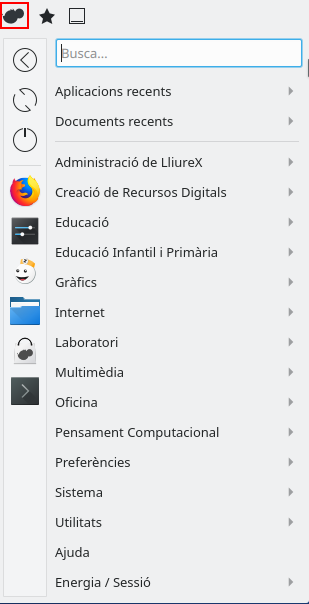 L’eina gràfica per a gestionar usuaris locals en Lliurex 19 és el gestor d’usuaris de KDE. Es troba dins de les preferències del sistema de l’escriptori Plasma 5 (vegeu la captura 2.2.1). Es pot obrir també buscant-ho en el menú principal de Lliurex (vegeu captura 2.1.2).