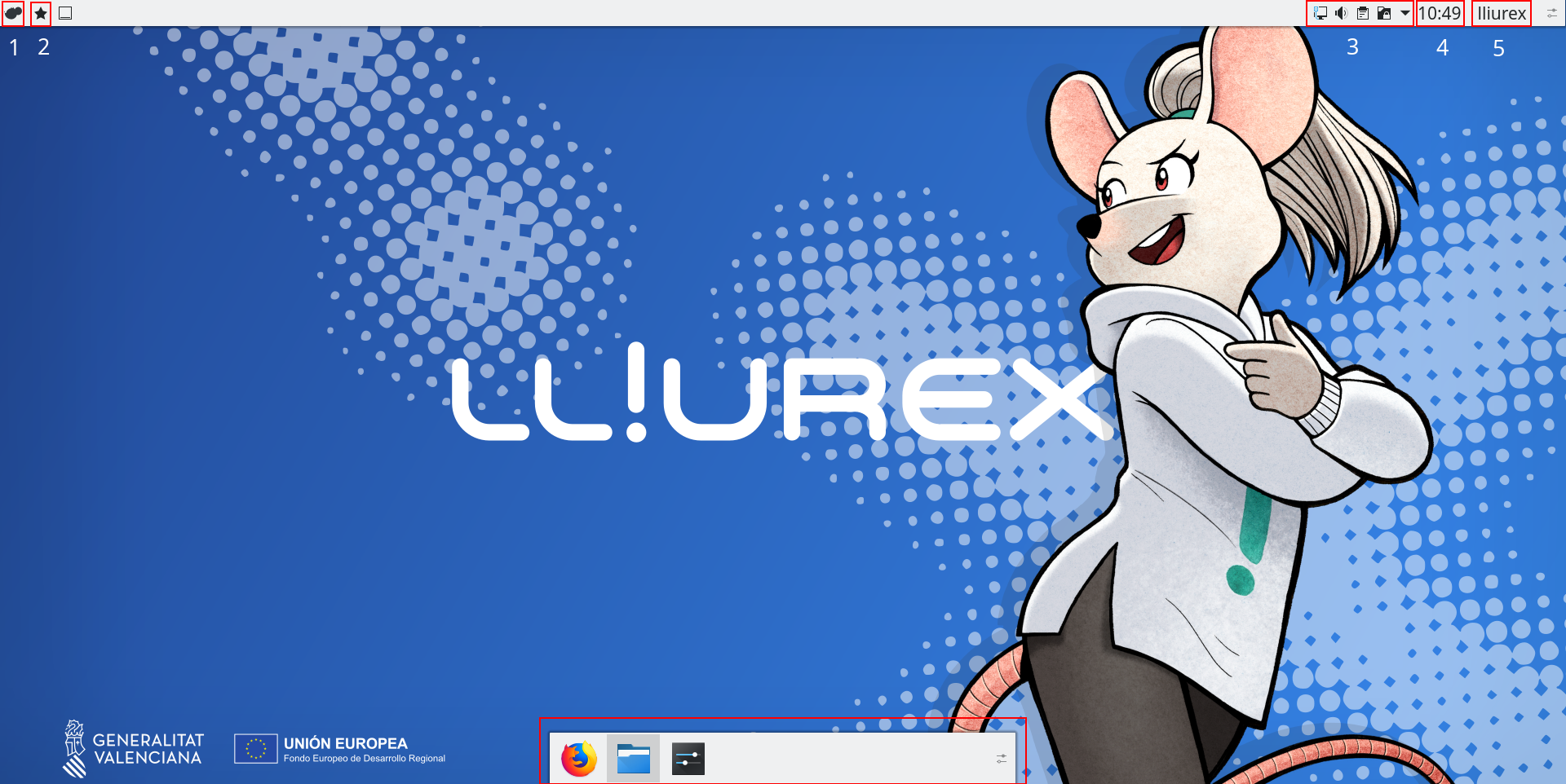 La tria de la configuració de l’escriptori, es pot fer durant la instal·lació de LliureX i, a més, en qualsevol altre moment mitjançant l’aplicació Aspecte d’escriptori de LliureX. A continuació es descriuen cadascuna de les parts de l’entorn d’escriptori visibles en aquestes configuracions.