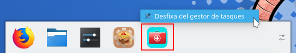 Per a eliminar una aplicació del gestor de tasques cal fer clic sobre la seua icona amb el botó dret del ratolí i seleccionar l’opció Desfixa del gestor de tasques.
