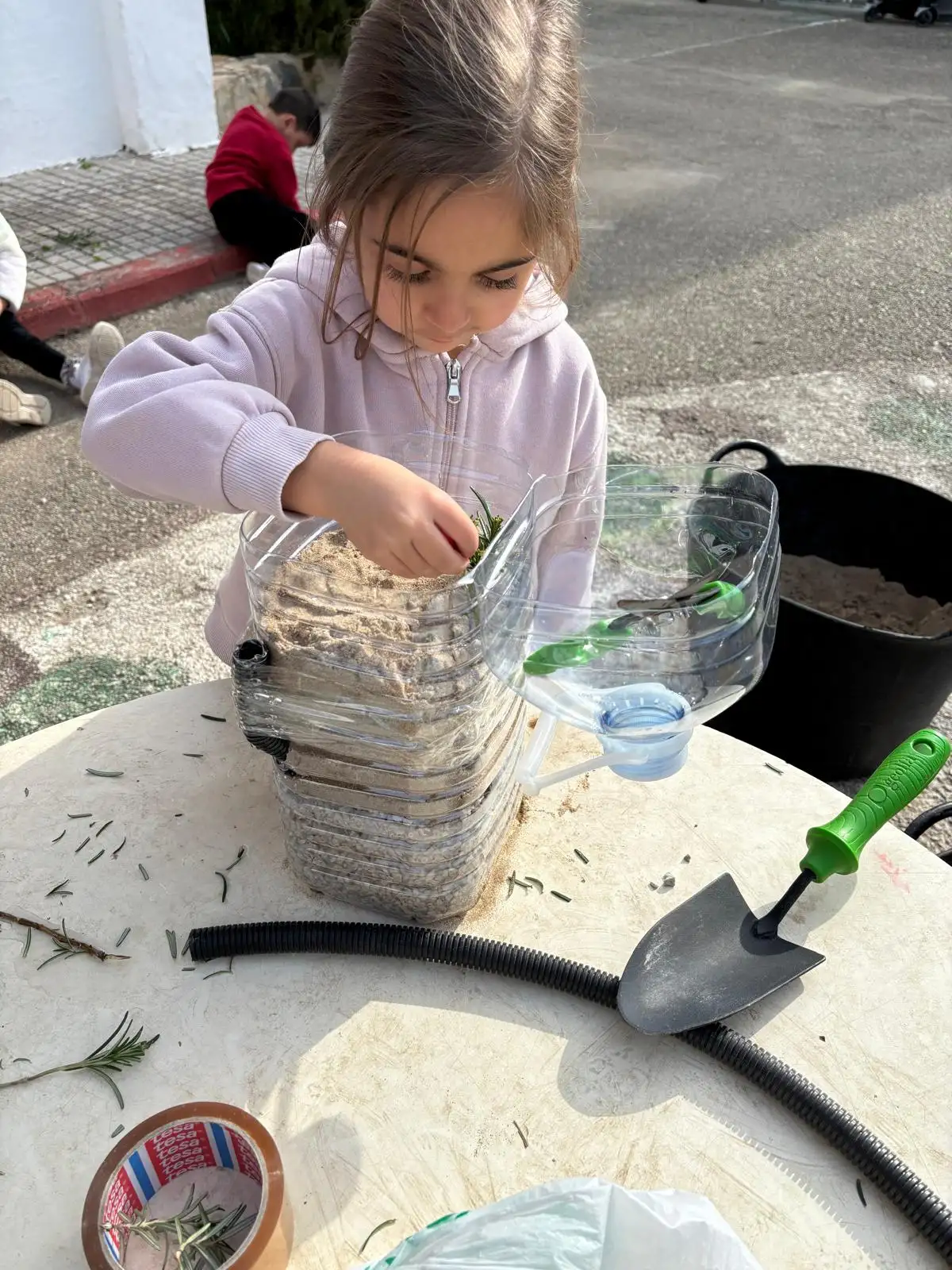 Aquest dimecres, aprofitant la visita del nostre amic Paco a la sessió de l’hort escolar hem plantat esqueixos de romer seguint tot el procés pas a pas: preparar la grava i la terra, col·locar amb cura l’esqueix i, finalment, regar-lo.