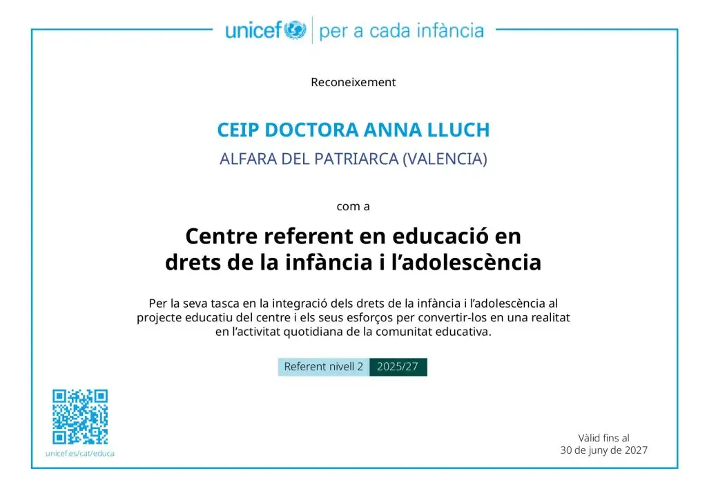 Benvinguts i benvingudes al Web del CEIP Doctora Anna Lluch d’Alfara del Patriarca. Una escola respectuosa, sostenible, promotora de l’esport, solidària, segura, protegida, familiar, oberta a l’entorn i més. Vine a conèixer-nos!!!