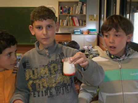 Per aquesta pràctica van portar a escola dos iogurteres. En un got menudet van mesclar llet anb dues culleradetes de iogurt natural i sense sucre. El van deixar durant 8/10 hores, durant eixe temps els ferments làctics del iogurt van fer collar la llet i van obtindre un completament natural. Després el van deixar al frigorífic i va ser un bon esmorzar per a l’hora del pati