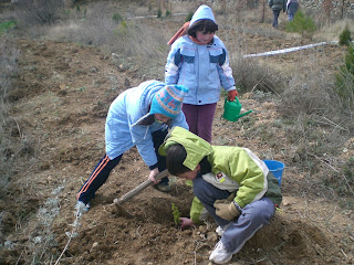 Com cada any, l’alumnat de primària vam anar a plantar arbres a la parcel·la que tenim dalt de la Teuleria. Els xiquets anaven en grups de 3, un feia el forat amb l’aixadella, altre plantava l’arbre i el tercer, portava aigua amb un poal o regadora per regar-lo.
