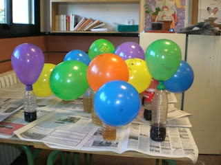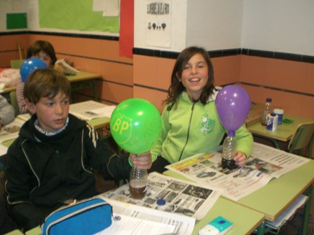 Vam introduir dos cullerades de bicarbonat dins els globus, després introduïm el vinagre dins l’ampolla d’aigua i ajustem la boca del globus a la de la botella. Per últim buidem el bicarbonat dins la botella amb el vinagre…I es produeix una reacció en la que es desprèn diòxid de carboni que queda emmagatzemat en el globus que per això s’unfla. Ha hi haugt una reacció químicaen la que s’han mesclat un àcid (el vinagre) i una sal (el bicarbonat), formant-se un nou element i desprenen dioxid de carboni.