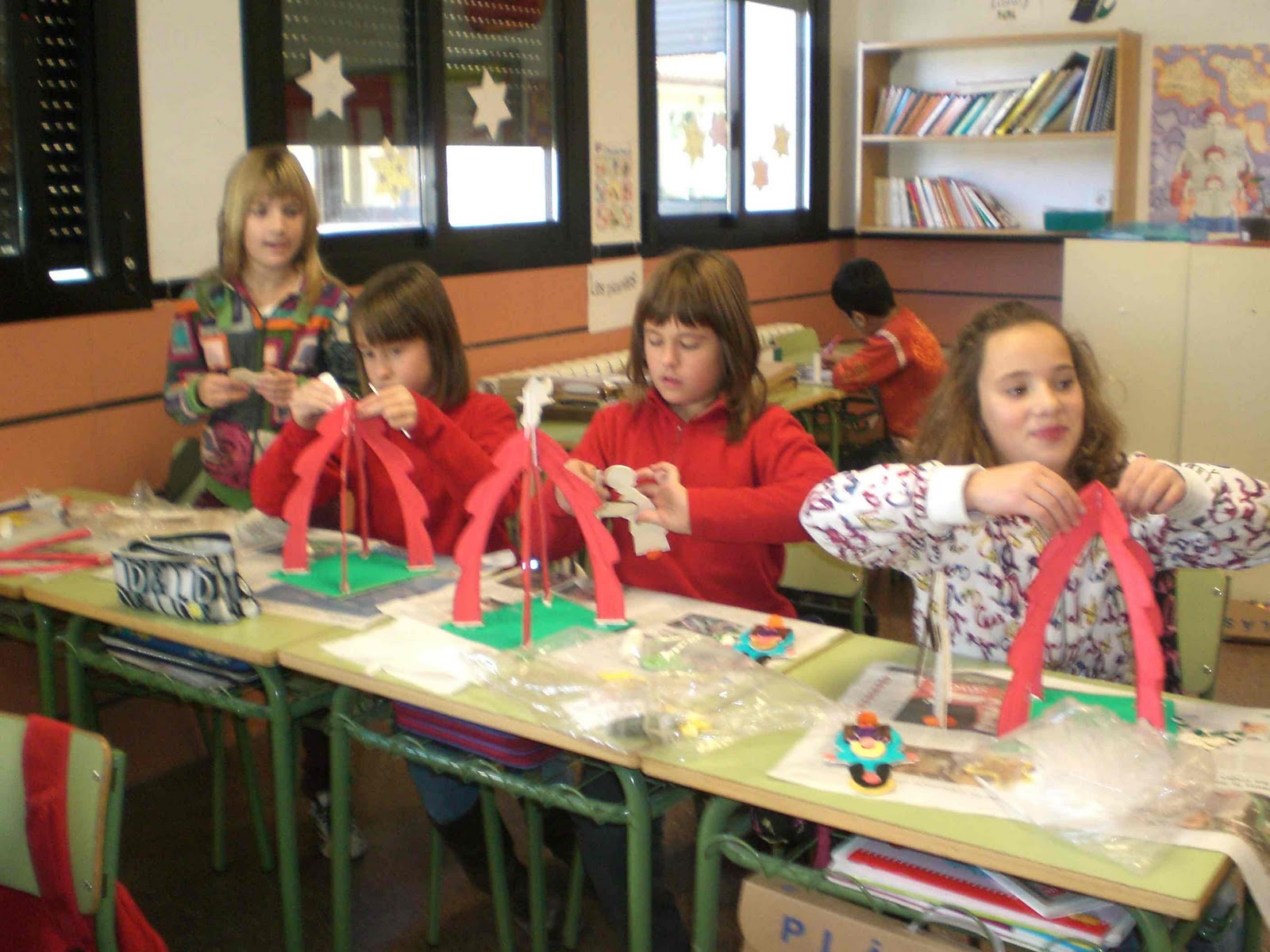 En 4º han elaborado un BELÉN PLATAFORMAS. Es una obra de fantasía, sobre tema navideño. Consiste en enmarcar, dentro de la silueta de un abeto, dos plataformas giratorias que sostienen las tradicionales figuras del pesebre. Con diferentes materiales se simbolizan elementos propios de estas fechas.