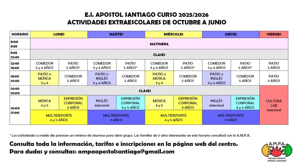 *Consultar con la A.M.P.A. las opciones para actividades extraescolares de música e inglés entre las 12.40 y las 14.40 para 5 años: ampaapostolsantiago@gmail.com